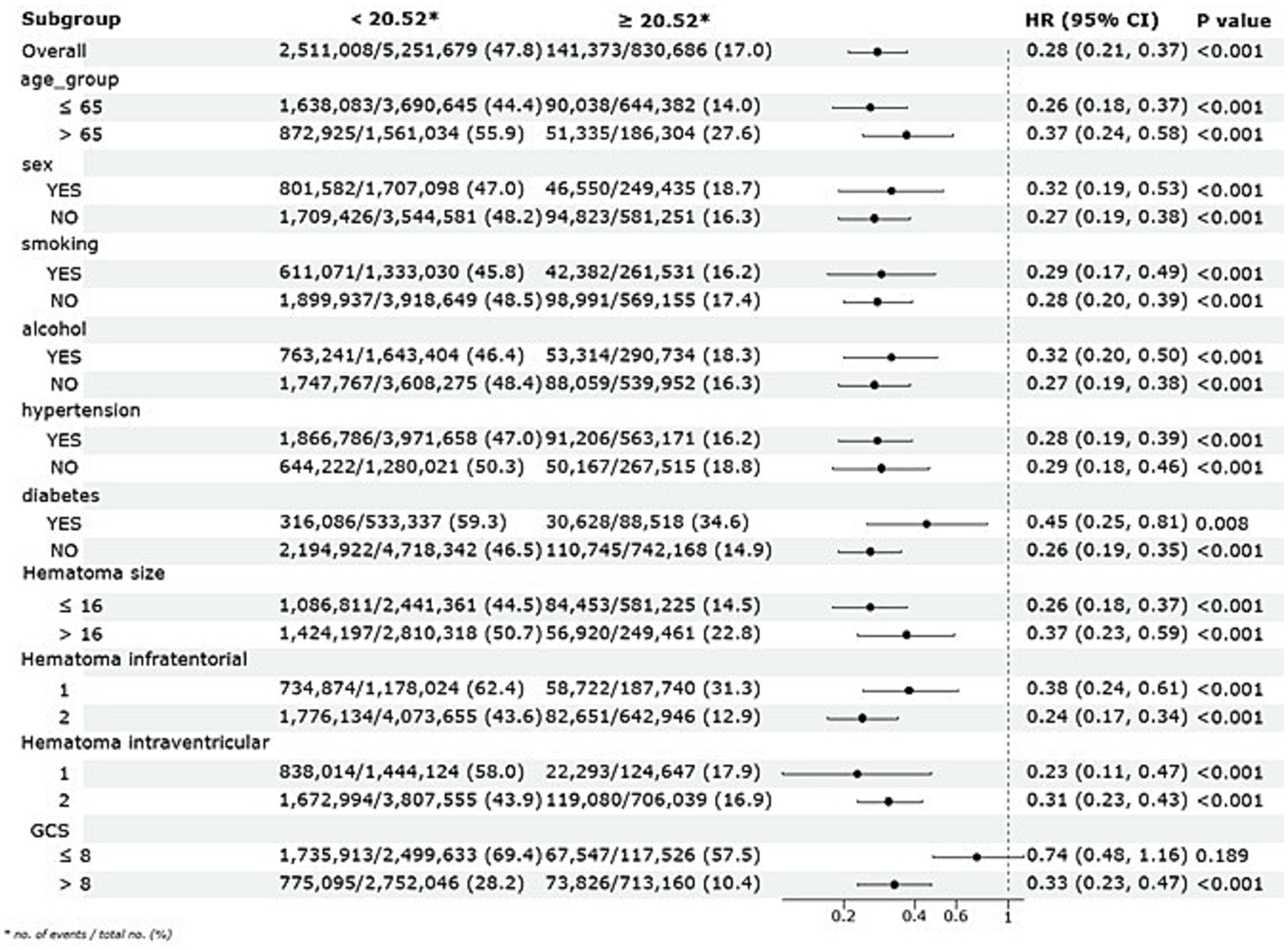 Cox proportional hazards regression models, adjusted for confounders such as age, GCS, hematoma volume, diabetes, and the supratentorial or infratentorial location of hematomas, were developed to assess the association between ALI and long-term mortality. Subgroup analyses were performed to evaluate effect modification by stratifying patients based on variables such as age, sex, and hematoma location.