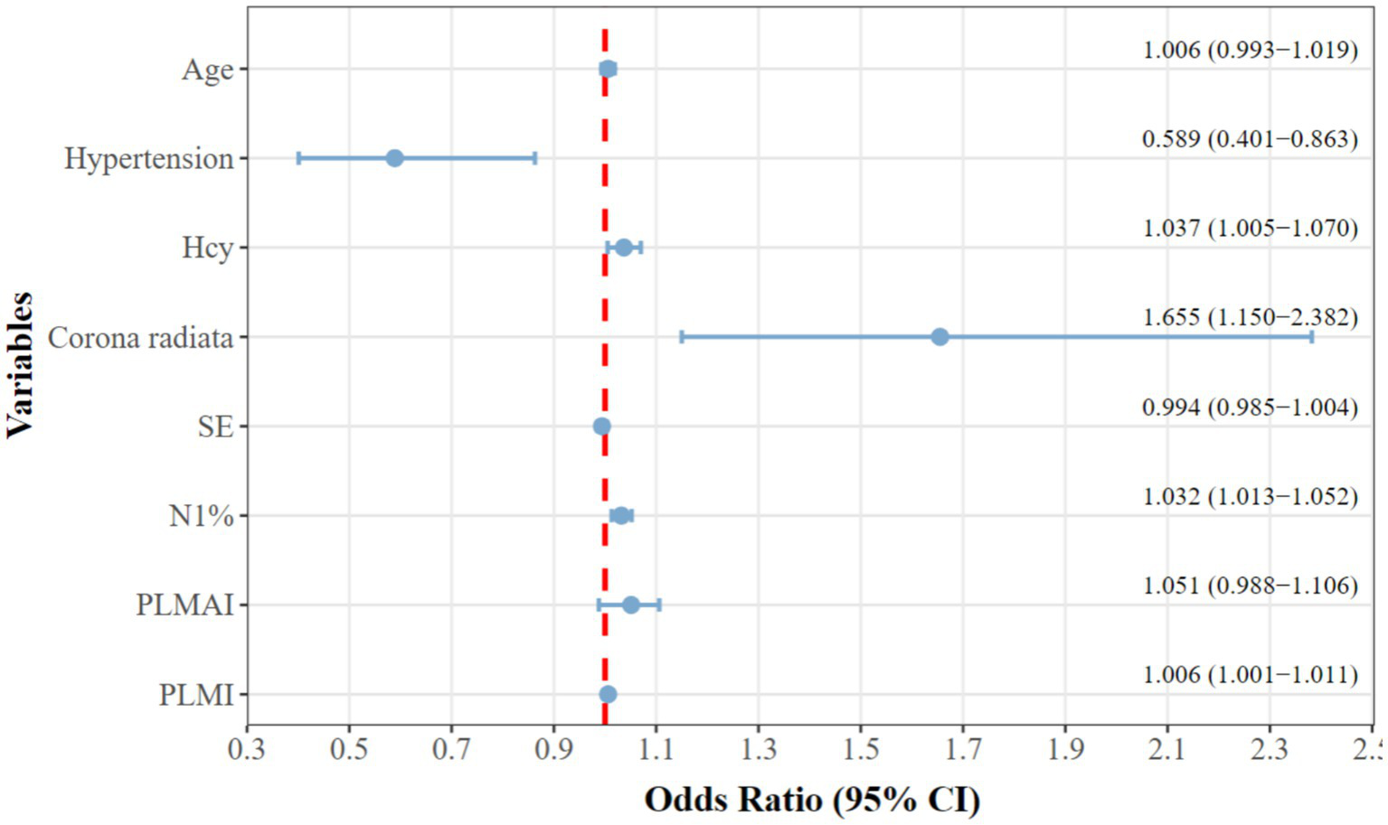 Indicators with p < 0.05 from the correlation analysis, along with age, hypertension, HCY, and radiate crown area cerebral infarction, were included as covariates, with mRS grouping as the dependent variable (Table 5). The results indicated that patients with a history of hypertension (OR = 0.589, 95% CI = 0.401 to 0.863), higher HCY levels (OR = 1.037, 95% CI = 1.005 to 1.070), radiate crown area cerebral infarction (OR = 1.655, 95% CI = 1.150 to 2.382), longer N1% (OR = 1.032, 95% CI = 1.013 to 1.052), and higher PLMI (OR = 1.006, 95% CI = 1.001 to 1.010) are risk factors for the prognosis of Acute minor cerebral infarction patients at 3 months (p < 0.05). To enhance clinical interpretability, Figure 2 presents a forest plot of the adjusted odds ratios from the binary logistic regression. Although all five factors are risk factors for poor outcome, PLMI was a novel and modifiable target. Systematic sleep monitoring (e.g., polysomnography) in patients with minor acute stroke can identify high-risk groups for early PLMS intervention, which may improve long-term neurologic recovery.
