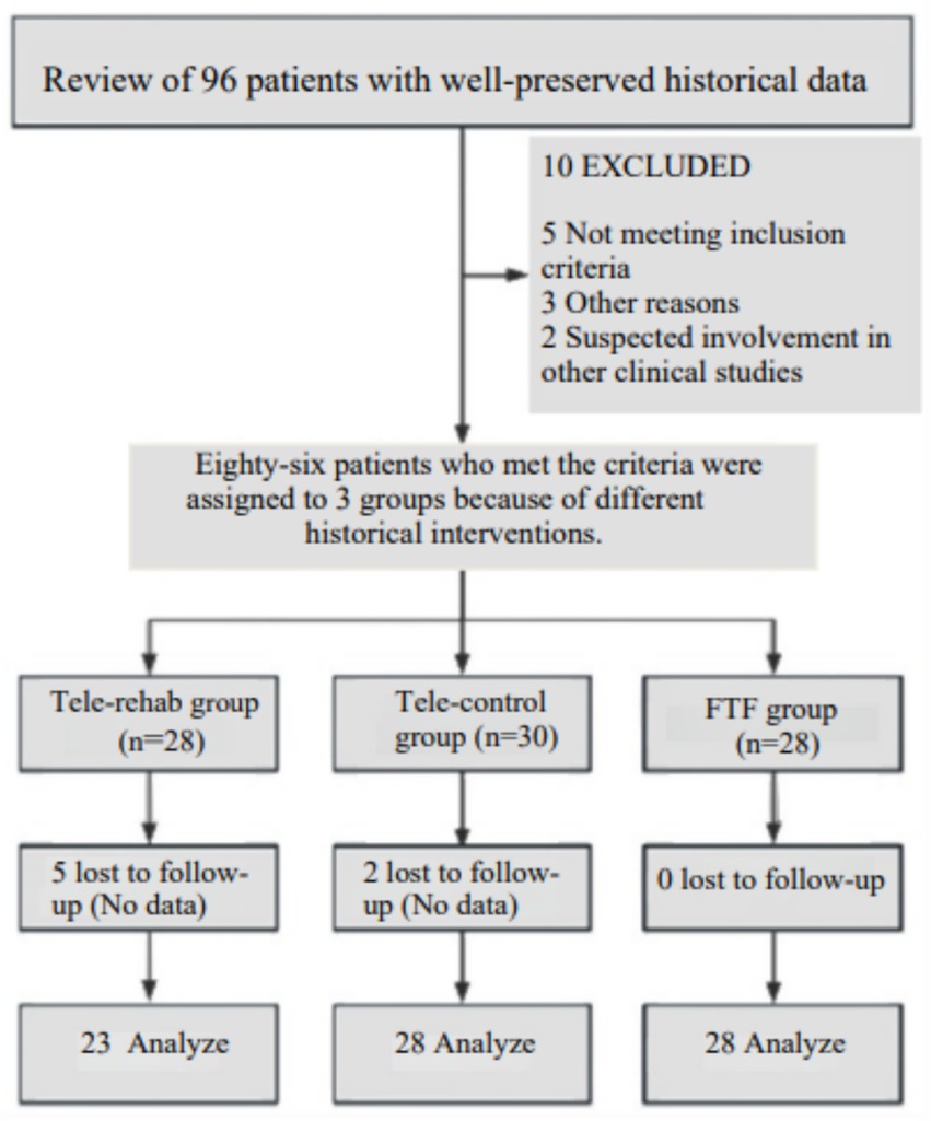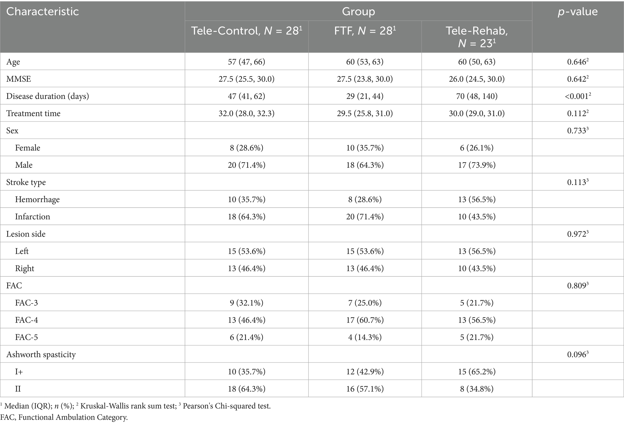 A total of 96 stroke patients were recruited, 10 patients were excluded for various reasons, 86 people were categorized into three groups because of the different types of intervention, of which 7 without data and withdrew from the study. A total of 79 subjects completed the trial (see Figure 1 for the inclusion flowchart), and no adverse reactions were reported. General information, including mean age, MMSE scores, effective duration of intervention, gender, stroke type, and site of injury, was statistically analyzed across the three groups, and the differences were not statistically significant (p > 0.05). There was a significant difference in the disease duration among the three groups (p<0.001), with the Tele-Rehab group having the longest disease duration, followed by the Tele-Control group, and the shortest being the FTF group, we used ANCOVA to correct for differences in disease duration. The detailed results are shown in Table 2.