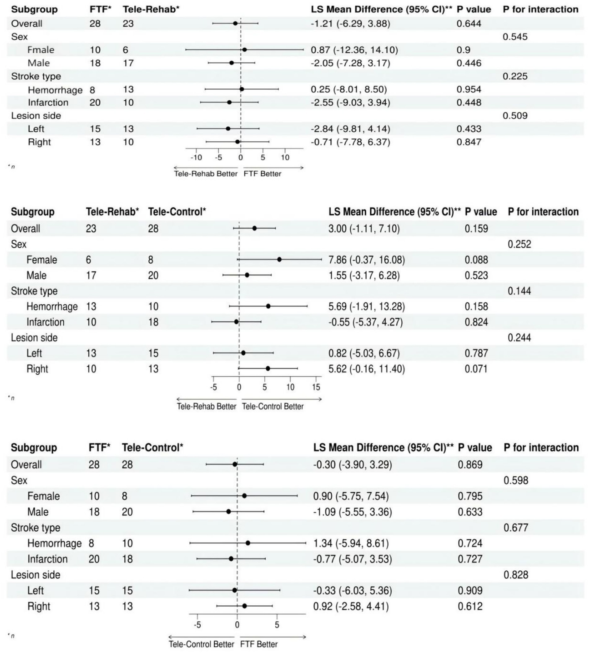Subgroup analyses were performed to examine differences across subgroups (gender, stroke type, and lesion side) and whether there is any difference in efficacy, the least squares mean and its confidence interval based on the ANOVA model and the p-value showing the interaction can help to determine the difference between different groups, so we selected the FMA as an outcome indicator to draw the forest plot for subgroup analysis. In our study, all statistical analyses were performed using the R software (version 4.2.2).