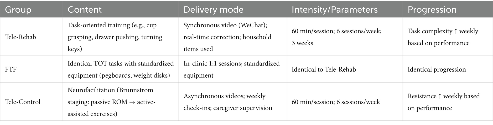 The Tele-Rehab group requires the patients to carry out targeted, targeted, and systematic upper limb task-oriented training at home under the remote guidance of the therapist. The FTF group was treated by a therapist in an occupational therapist for face-to-face, task-oriented training. In the Tele-Control group, patients were asked to carry out upper limb rehabilitation therapy at home on their own. Quality control: Dual camera angles (wide + close-up), therapist error screening every 15 min, daily video logs, therapist video audits (exercises with >30% deviation triggered in-person reassessment).