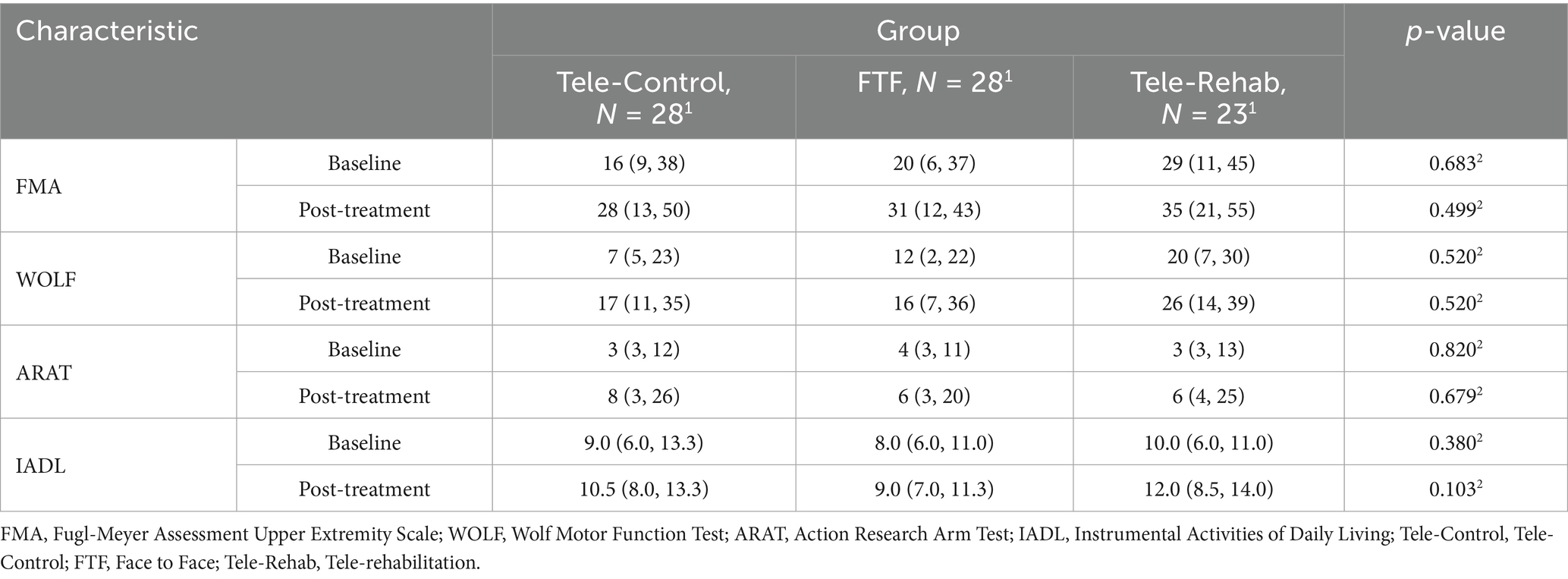Results: In total, 79 participants completed the trial: Tele-rehab group (n = 23), FTF group (n = 28), and Tele-Control group (n = 28). Improvements in FMA-UE, WMFT, ARAT, and IADL were found in all three groups (p<0.05). The mean change in FMA-UE was 9.4 in the Tele-rehab group, 6.4 in the FTF group, and 6.7 in the Tele-control group. The mean difference between the Tele-Rehab and FTF groups was 3.0, and the mean difference between the Tele-Rehab and Tele-Control groups was 2.7, with the upper limit of the 95% confidence interval not exceeding the margin of non-inferiority. Non-inferiority was demonstrated, as the 95% CI did not cross the margin in FMA-UE difference scores before and after the intervention in the Tele-rehab group compared with the FTF group (p > 0.05), nor in the FTF group compared with the Tele-Control group before and after the intervention (p > 0.05). The 95% CI for FMA-UE improvement between Tele-rehab TOT and face-to-face TOT was [−0.81, 7.39], not exceeding the non-inferiority margin of 12.4.