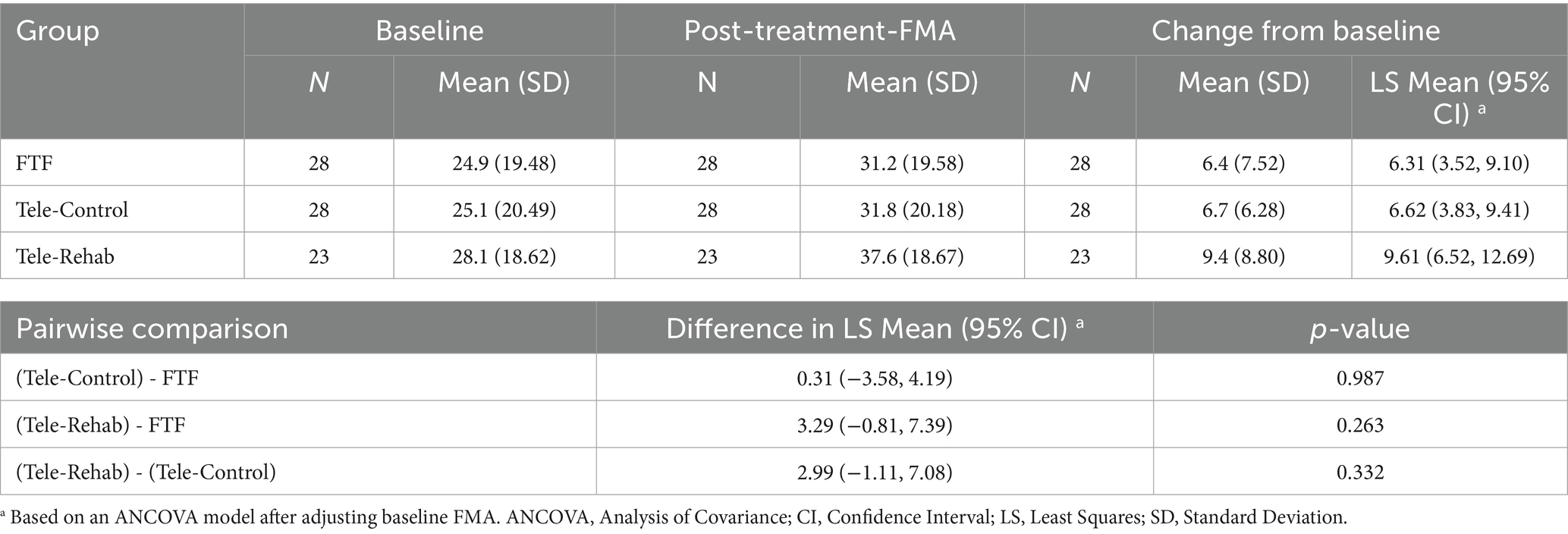 For the primary outcome (FMA-UE), the 95% CI of the between-group difference [−0.81, 7.39] did not cross the non-inferiority margin (12.4). The upper limit (7.39) was 5.01 points below the MCID - exceeding FMA-UE’s typical standard error of measurement (SEM = 3.2 points (24)). Sensitivity analysis using bias-corrected bootstrapping yielded consistent results (95% CI: −0.75 to 7.31).