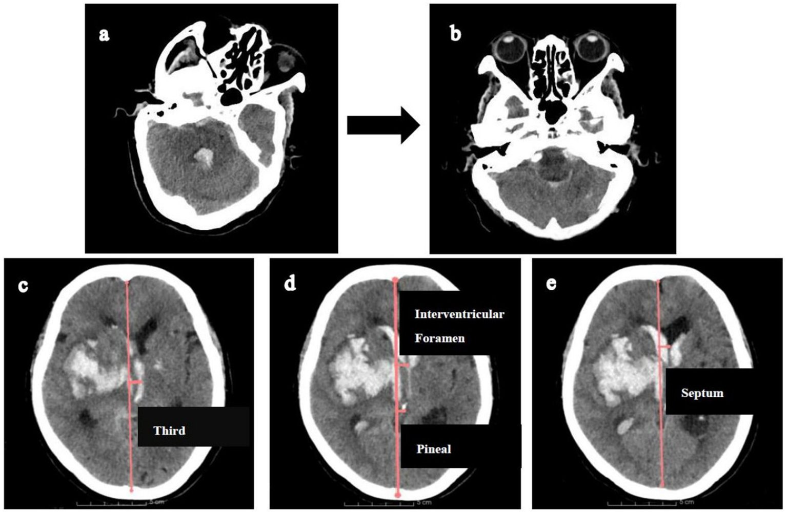 Illustration of measuring midline shifts (MLS) at various levels. Firstly, CT reconstructions (a,b) were aligned with the orbitomeatal line to facilitate accurate midline shift measurements. Then, MLS was quantified by constructing an ideal midline (red line), linking the most anterior and posterior visible points on the falx. (c). MLS at the level of third ventricle. (d) MLS at the level of interventricular foramen and pineal gland. (e) MLS at the level of septum pellucidum.