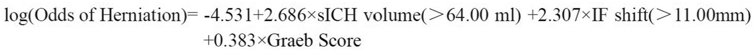 Our prediction model integrates three key biomarkers—hematoma volume, interventricular foramen displacement, and Graeb score—to quantify herniation risk in basal ganglia/thalamic sICH. This addresses a critical gap where current practice relies on qualitative metrics (e.g., GCS, ICH Score) lacking herniation specificity.