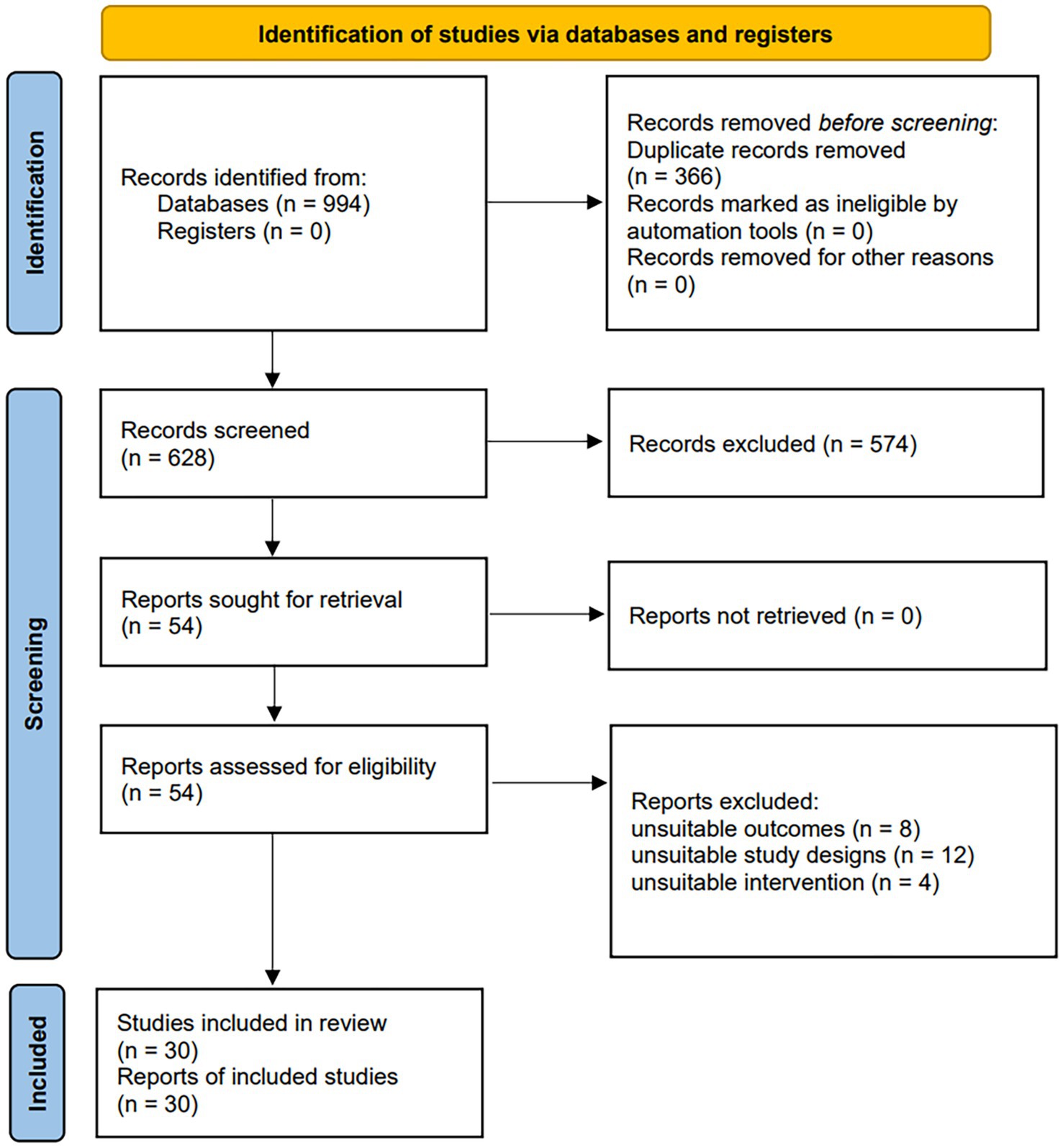 A total of seven databases were searched for literature, and the initial search resulted in 994 studies. Duplicate studies were screened out and removed by software, leaving 628 studies. Two researchers (YZL and CG) read the titles and abstracts of these studies and screened out 574 that were irrelevant to the topic. The remaining 54 studies were downloaded in full and read through, and 24 studies were still excluded (8 studies were screened for not using the internationally accepted aphasia ratings listed in the inclusion criteria or data on outcome indicators were not fully available; 12 studies were screened for not strictly using a randomized controlled trial design; four studies were screened for not using rTMS as the primary intervention in an experimental comparison study). Finally, 30 eligible studies were included (30–59) (Figure 1).