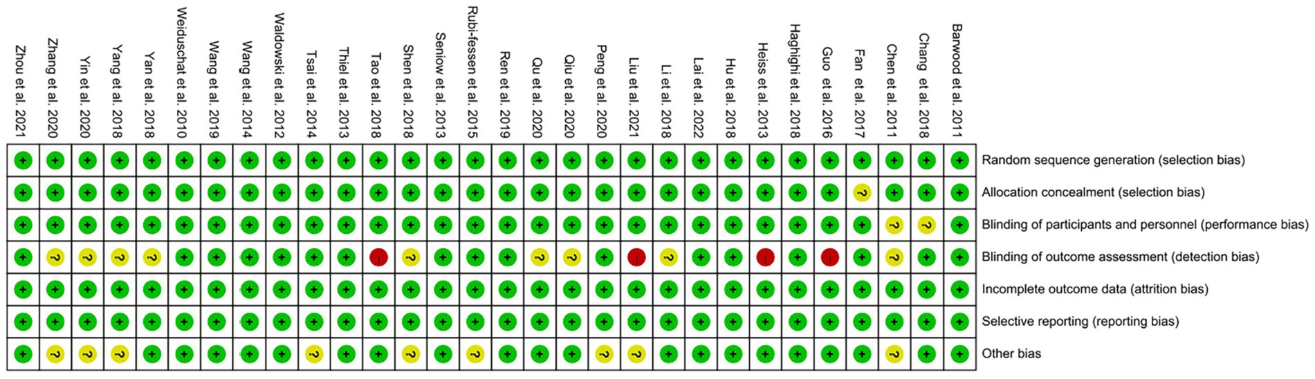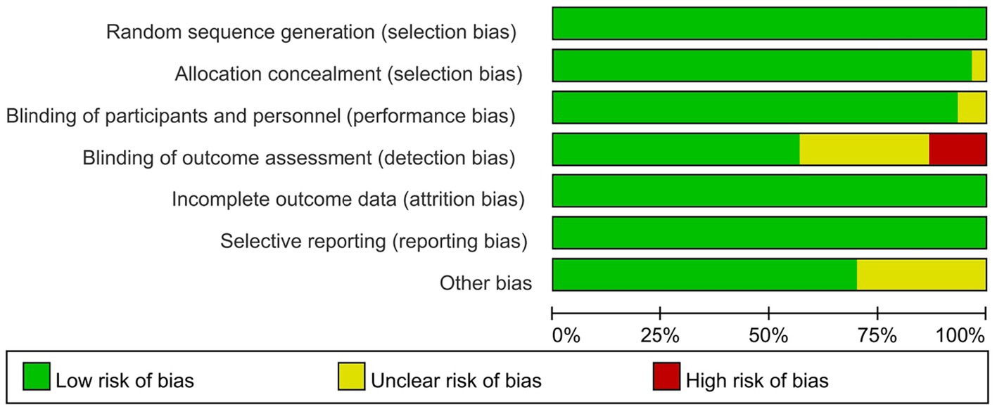 The risk of bias assessment showed that in all included RCTs, four RCTs (31, 40, 49, 55) did not use blinding for the assessment of outcome indicators and had a high risk of detection bias. And nine studies (31, 33, 34, 37, 41, 45, 50, 52, 58) did not explicitly report blinding for assessing outcome indicators, and the risk of detection bias was unclear. The risk of bias was low for all RCTs in the other items evaluated for risk of bias. Overall, the risk of bias was low in our included studies (Figures 2, 3).