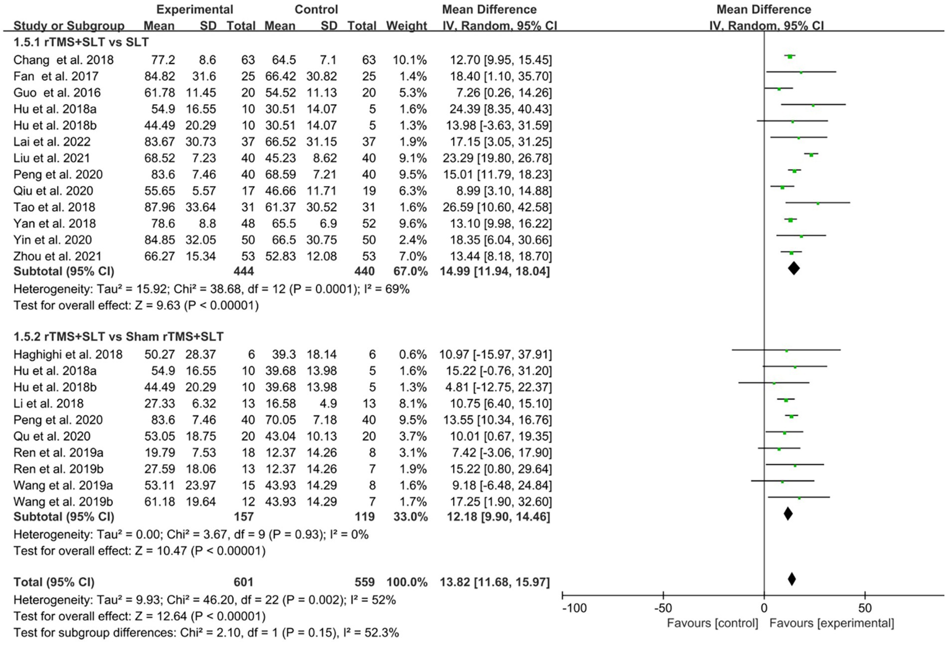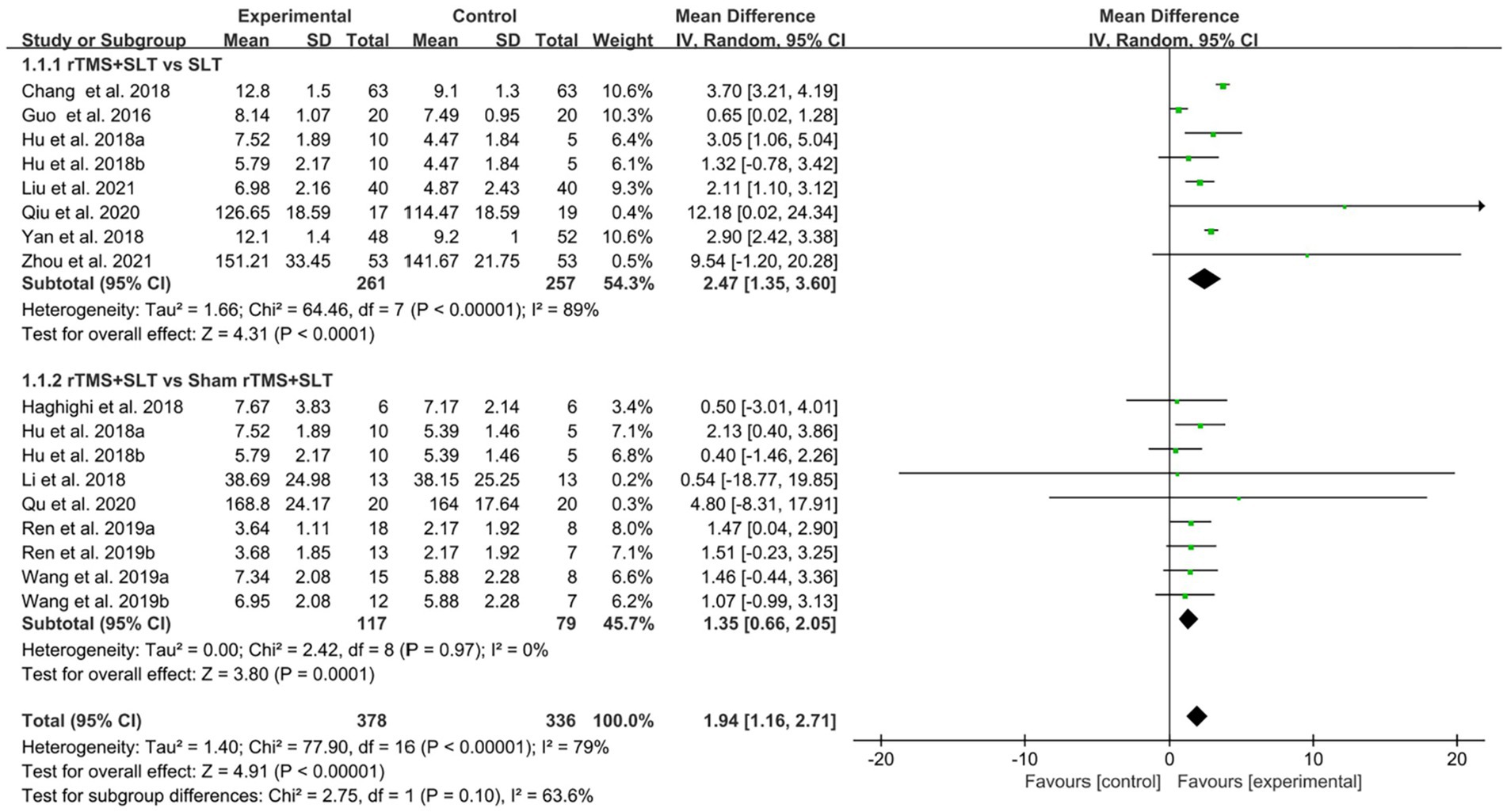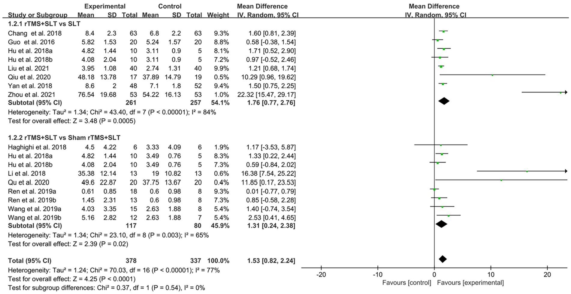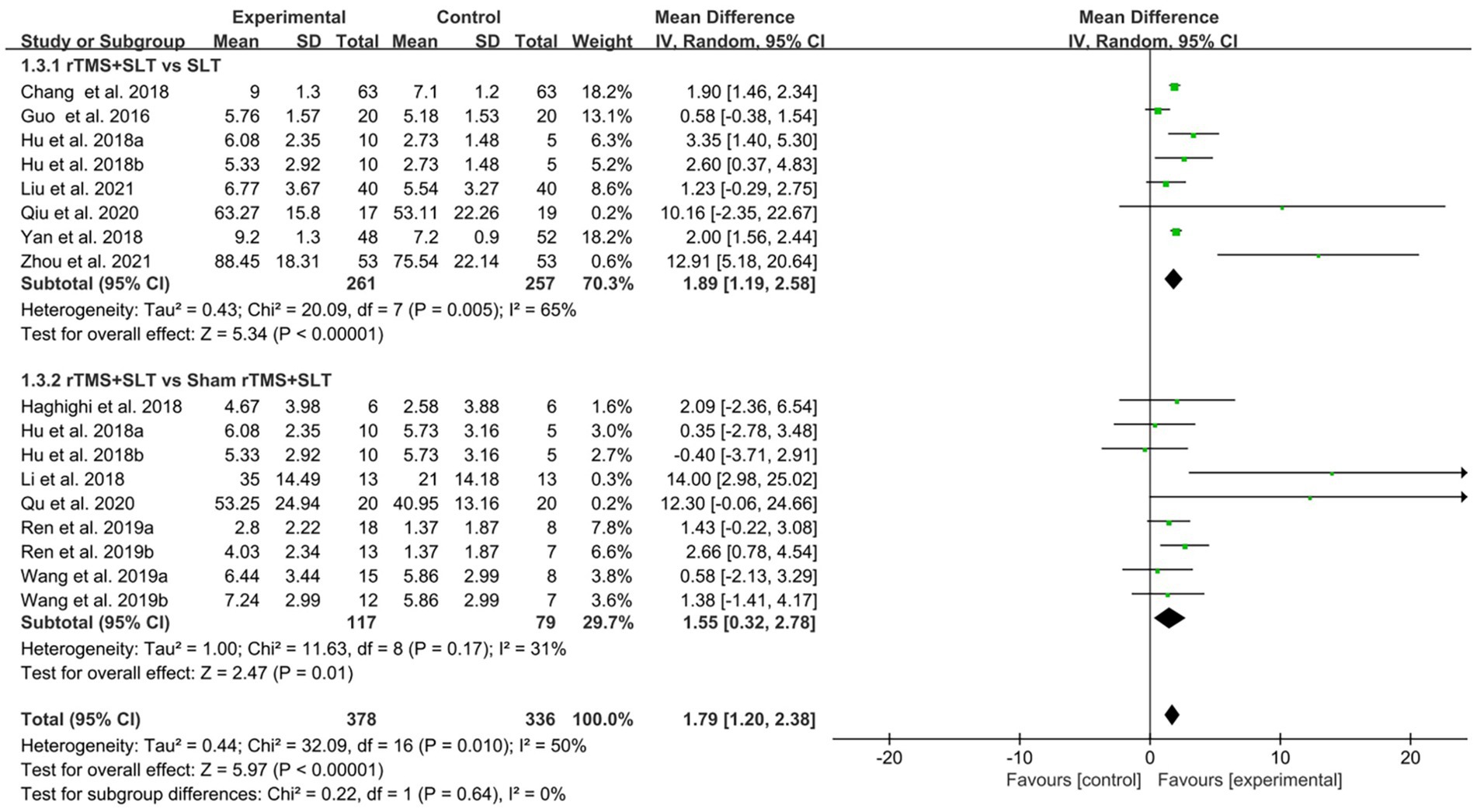 Results: Thirty relevant RCTs were included, involving a total of 1,597 patients. The analysis turned out that rTMS combined with speech and language therapy (SLT) resulted in significant improvements in auditory comprehension, naming, repetition, and spontaneous speech in patients with PSA compared with sham stimulation combined with SLT or SLT alone in the control group. (auditory comprehension, MD = 1.94, 95%CI = [1.16, 2.17], p < 0.001; naming, MD = 1.53, 95%CI = [0.82, 2.24], p < 0.001; repetition, MD = 1.79, 95%CI = [1.20, 2.38], p < 0.001; spontaneous speech, MD = 1.97, 95%CI = [1.65, 2.29], p < 0.001).