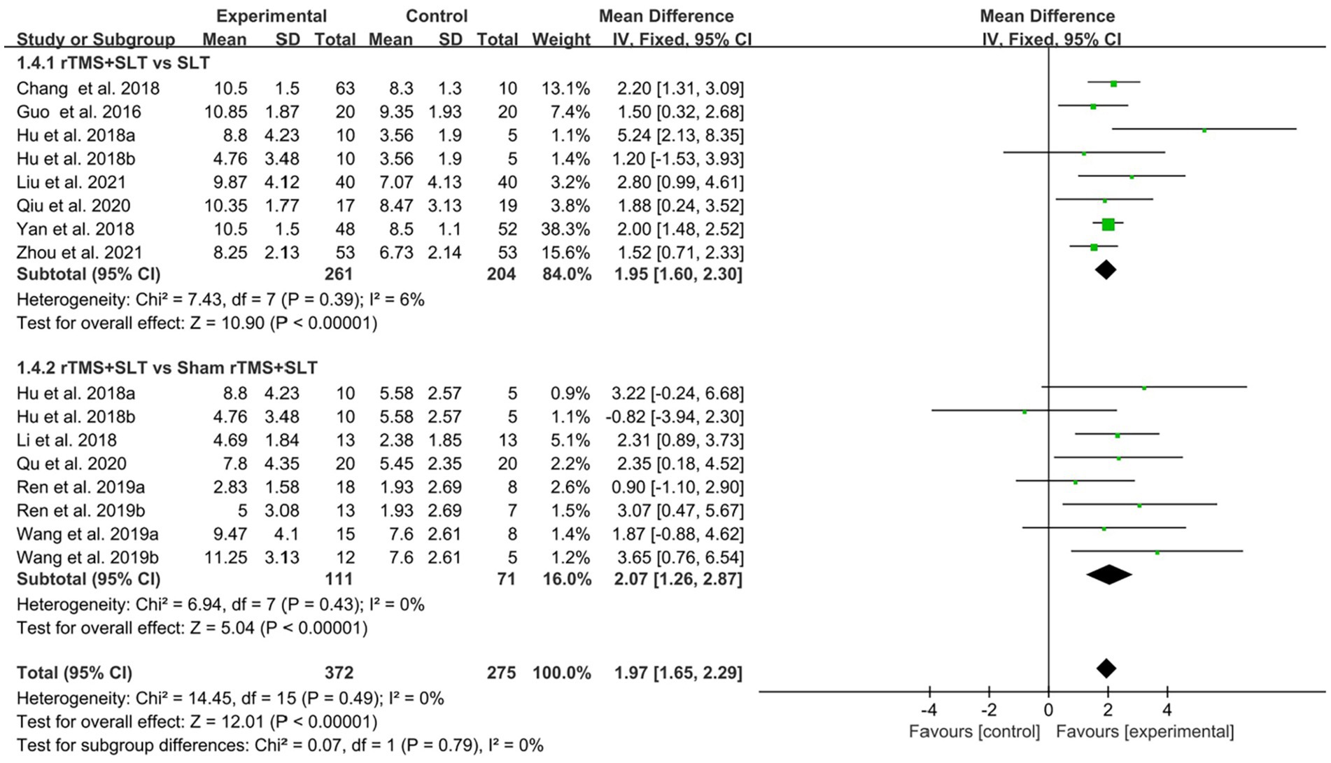 In comparison, the 1 Hz group showed better improvement than the 0.5 Hz group in spontaneous speech indexes. The results of Wang et al. suggest that 0.5 Hz and 1 Hz rTMS can produce respective more advantageous therapeutic effects on different aphasic symptoms, so should different frequencies of rTMS should be selected for targeted treatment to enhance the therapeutic effects of rTMS on PSA patients corresponding to various symptoms of aphasia. More RCTs with different stimulation frequencies of rTMS for PSA need to be conducted in the future to expand the selection of treatment parameters so that we can provide individualized treatment for PSA patients with different symptoms in the clinical treatment of PSA patients.