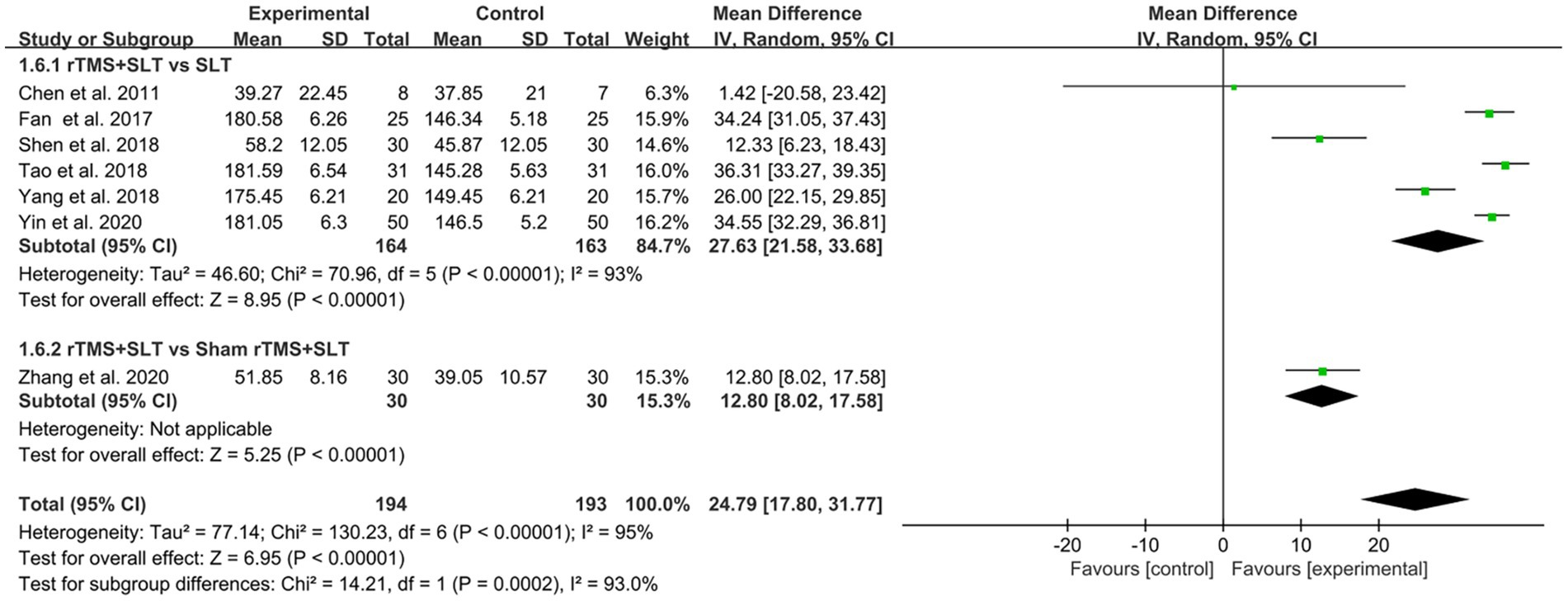 Among the 30 RCTs included, only three employed high-frequency rTMS; the remainder used low-frequency stimulation, and no uniform outcome measures were adopted. Thus, the available data are insufficient for a subgroup analysis comparing the efficacy of high- versus low-frequency rTMS. And the results of forest plot data show that both high-frequency rTMS and low-frequency rTMS can have a positive therapeutic effect on aphasia in stroke patients. Combined with the balance theory of both human hemispheres (73), there are good reasons to try the combination of high-frequency rTMS and low-frequency rTMS and to conduct a comparative efficacy study with low-frequency rTMS or high-frequency rTMS alone to explore the best treatment option of rTMS for post-stroke aphasia treatment. Yan et al. (45) reported in the previous study that combining high-frequency rTMS with low-frequency rTMS can effectively promote the recovery of speech function in stroke patients. Moreover, Hu et al. (44) also proven that low-frequency rTMS had superior and longer-lasting therapeutic effects than high-frequency rTMS on the recovery of speech function in patients with non-fluent aphasia, especially in the areas of spontaneous speech, aphasia quotient, and auditory comprehension function. However, a study by Wang et al. (39) showed that there was no difference in the therapeutic effect of low-frequency rTMS of different frequencies on patients with PSA. It can be seen that more, multicenter, RCTs with large sample sizes of high-frequency rTMS in combination with low-frequency rTMS are still needed to further approach the optimal intervention parameters of rTMS for post-stroke aphasia in the future.