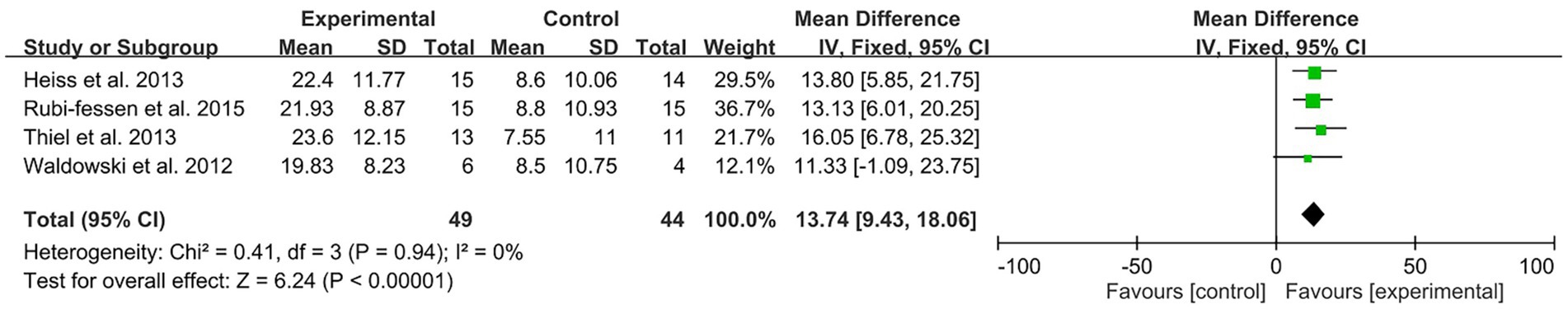 In 4 studies (50, 53, 55, 56), the verbal function of PSA patients was assessed using the AAT scale, with an I2 < 50% between studies, and we analyzed the data using a fixed effects model. The results of the forest plot analysis showed that compared to the control group, the experimental group showed a significant improvement in AAT scores compared with the control group (MD = 13.74, 95% CI = [9.43, 18.06], I2 = 0%, p < 0.001; Figure 10).