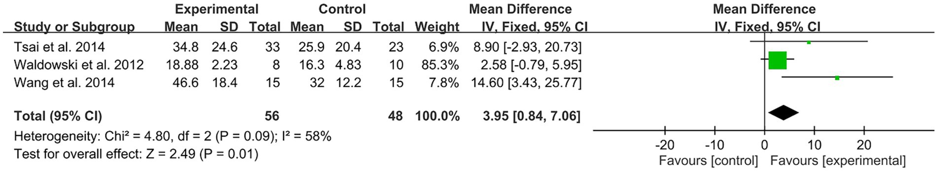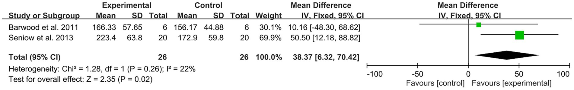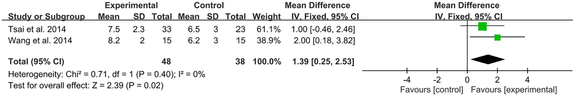 Two studies (51, 52) used the CCAT scale to assess language function in PSA patients, and the I2 value between studies was 0%, thus the data were analyzed using a fixed effects model. The results of the analysis of the forest plot showed that the experimental group had a more positive contribution in improving the CCAT scores of PSA patients compared to the control group (MD = 1.39, 95% CI = [0.25, 2.53], I2 = 0%, p = 0.02; Figure 12).