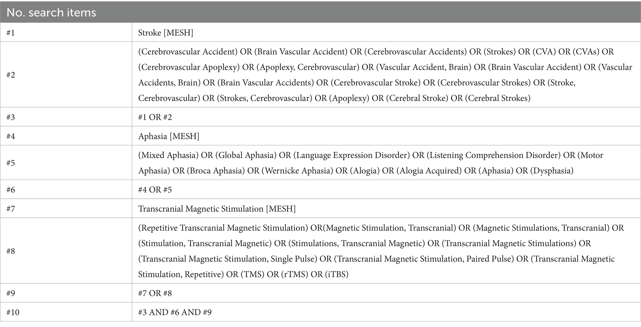 In the initial screening, two researchers (CG and YXD) independently searched RCTs related to the topic in seven databases: Web of Science, PubMed, Embase, Cochrane Library, CNKI, Wanfang Data, and PEDro. Search for studies published between the date of database creation and September 28, 2022. We searched for standardized disease names in the International Classification of Diseases, 11th edition (ICD − 11). Ultimately, we identified the keywords for this study as “Stroke,” “Aphasia,” “Language Expression Disorder,” “Listening Comprehension Disorder,” and “Repetitive Transcranial Magnetic Stimulation.” In addition, we manually searched other relevant literature, such as studies included in some systematic reviews and meta-analyses, to broaden the search for eligible articles. As an example, the search strategy for the PubMed database is as follows (Table 1).