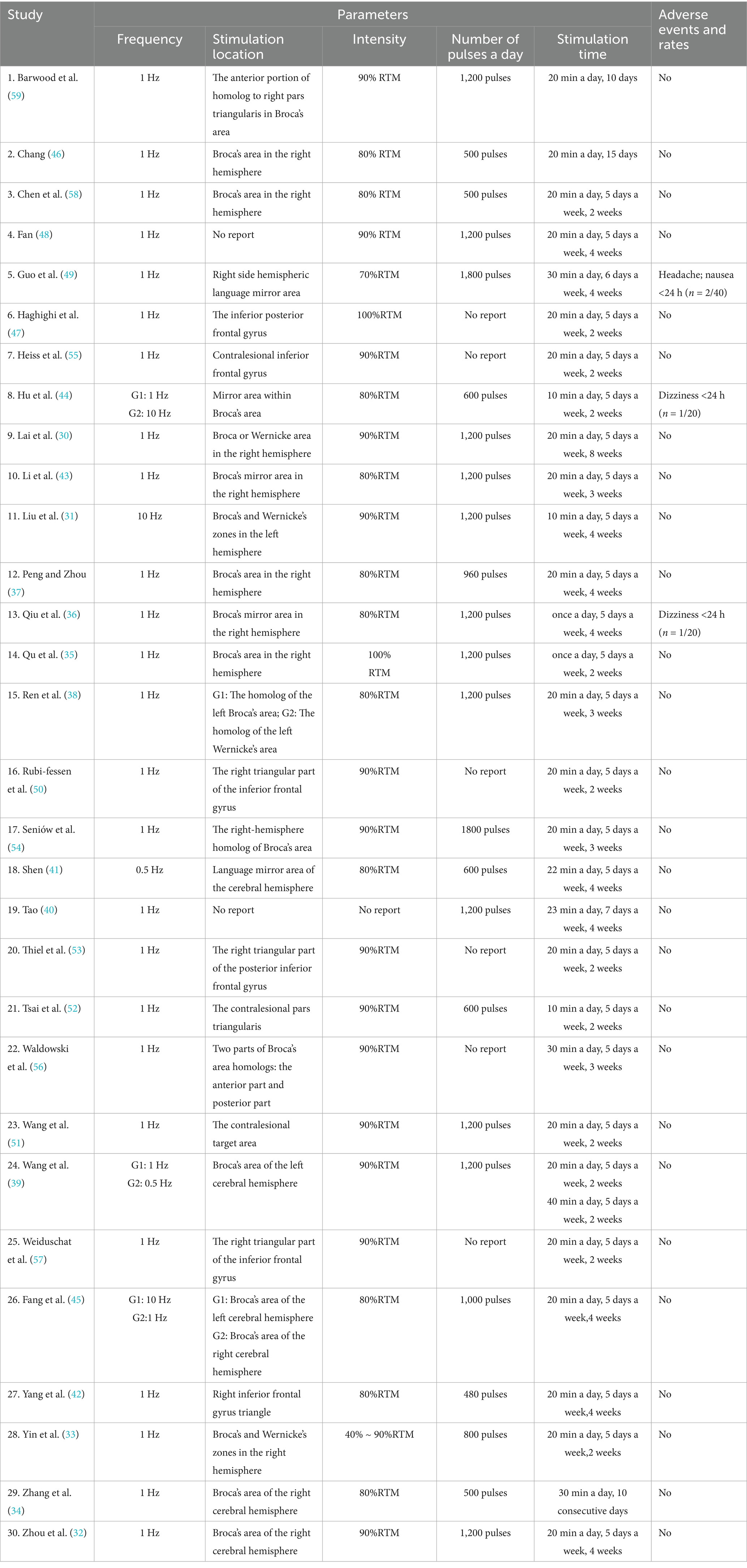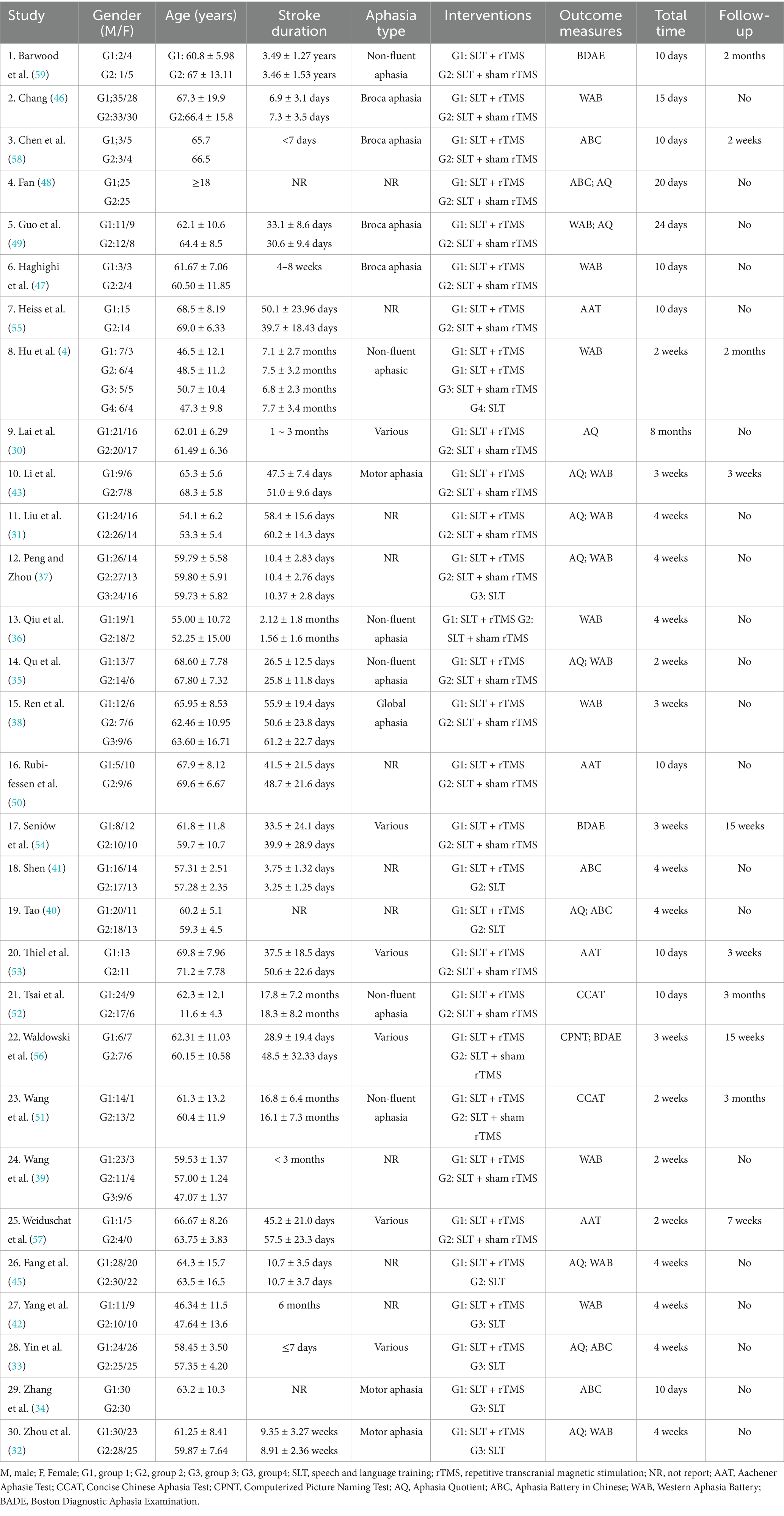 Across the included randomized controlled trials, rTMS was most commonly applied in conjunction with SLT, whereas a smaller number of trials compared rTMS plus SLT with SLT alone or with sham stimulation plus SLT. Only a few studies combined rTMS with pharmacological agents. This variability in study design illustrates that rTMS is more appropriately viewed as an adjunctive rather than independent therapy for PSA. To improve clarity, we have minimized use of acronyms in the Results section, spelling out the assessment tools (e.g., Western Aphasia Battery instead of WAB on first mention). Table 2 summarizes the basic data of the 30 RCTs. A total of 1,597 patients with PSA were included, with sample sizes ranging from 12 to 120, of which 819 patients with PSA were treated with rTMS. Subjects’ aphasia types had non-fluent aphasia, Broca aphasia, Motor aphasia, Global aphasia, and Various aphasia. Among the included RCTs, the outcome indicators for rating aphasia in post-stroke patients included Western Aphasia Battery (WAB), Aachener Aphasia Test (AAT), Aphasia Battery in Chinese (ABC), Aphasia Quotient (AQ); Concise Chinese Aphasia Test (CCAT); Computerized Picture Naming Test (CPNT) and Boston Diagnostic Aphasia Examination (BDAE).