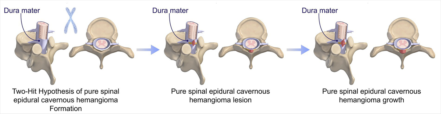 Cavernous hemangioma is a type of vascular malformation characterized by an abnormal aggregation of thin-walled blood vessels, which lack both elastic fiber layers and muscular layers (1). Histopathologically, these lesions are marked by vessel dilation, reduced contact between endothelial cells lining the vessels, and a deficiency in junctional complex proteins (1). Cavernous hemangiomas may occur sporadically or be inherited, with the latter associated with loss-of-function mutations in the KRIT1/CCM1, CCM2, or PDCD10/CCM3 genes (1, 6). The inheritance pattern is autosomal dominant, where a “second hit” mutation in the other functional allele precipitates disease onset (1) (Figure 5). Cerebral angiography typically does not reveal any large feeding arteries or draining veins. These hemangiomas are predominantly intracranial and infrequently occur within the spinal canal, with an annual incidence of 2.2 per 10 million, accounting for 5 to 12% of intraspinal vascular conditions (1). Based on their anatomical location, cavernous hemangiomas are classified into intramedullary, subdural extramedullary, epidural extramedullary, and vertebral body types (2, 5, 7, 8). Among these, the intramedullary type is the most prevalent, whereas the pure epidural type is relatively rare, representing only 4% of all neuraxial epidural tumors. Pagni et al. indicated that the onset of the disease typically occurred between the ages of 30 and 60 (9). The thoracic segment was the most frequently affected area, accounting for 54 to 60% of cases, whereas the cervical segment constituted 30%, and the lumbar segment comprised 10%. In our study, the cohort consisted of five female and two male patients, with a mean age of 49.4 years. Among these patients, five lesions were located in the thoracic spine, and one each in the cervical and lumbar spines, consistent with findings reported in the literature.