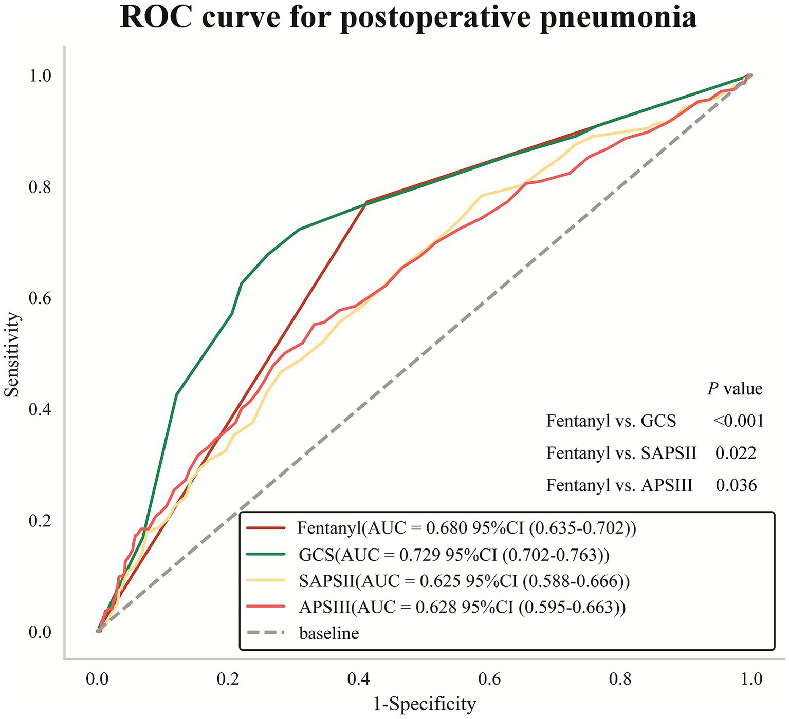 Fentanyl (AUC: 0.680) demonstrated a significantly higher predictive value than propofol (AUC: 0.604), midazolam (AUC: 0.608), and dexmedetomidine (AUC: 0.630) in predicting POP in patients with non-traumatic SAH (all Delong test p < 0.05). Multivariate logistic regression analysis revealed that fentanyl remained significantly associated with POP after adjustment for various confounders (Model 1: OR = 4.979, 95%CI: 3.652–6.874; Model 2: OR = 2.965, 95%CI: 2.138–4.152; Model 3: OR = 4.433, 95%CI: 3.239–4.152). CHF and CVD significantly modified the association of fentanyl with POP. Further, fentanyl demonstrated satisfactory clinical value and increased the predictive efficacy of the traditional disease severity scores.