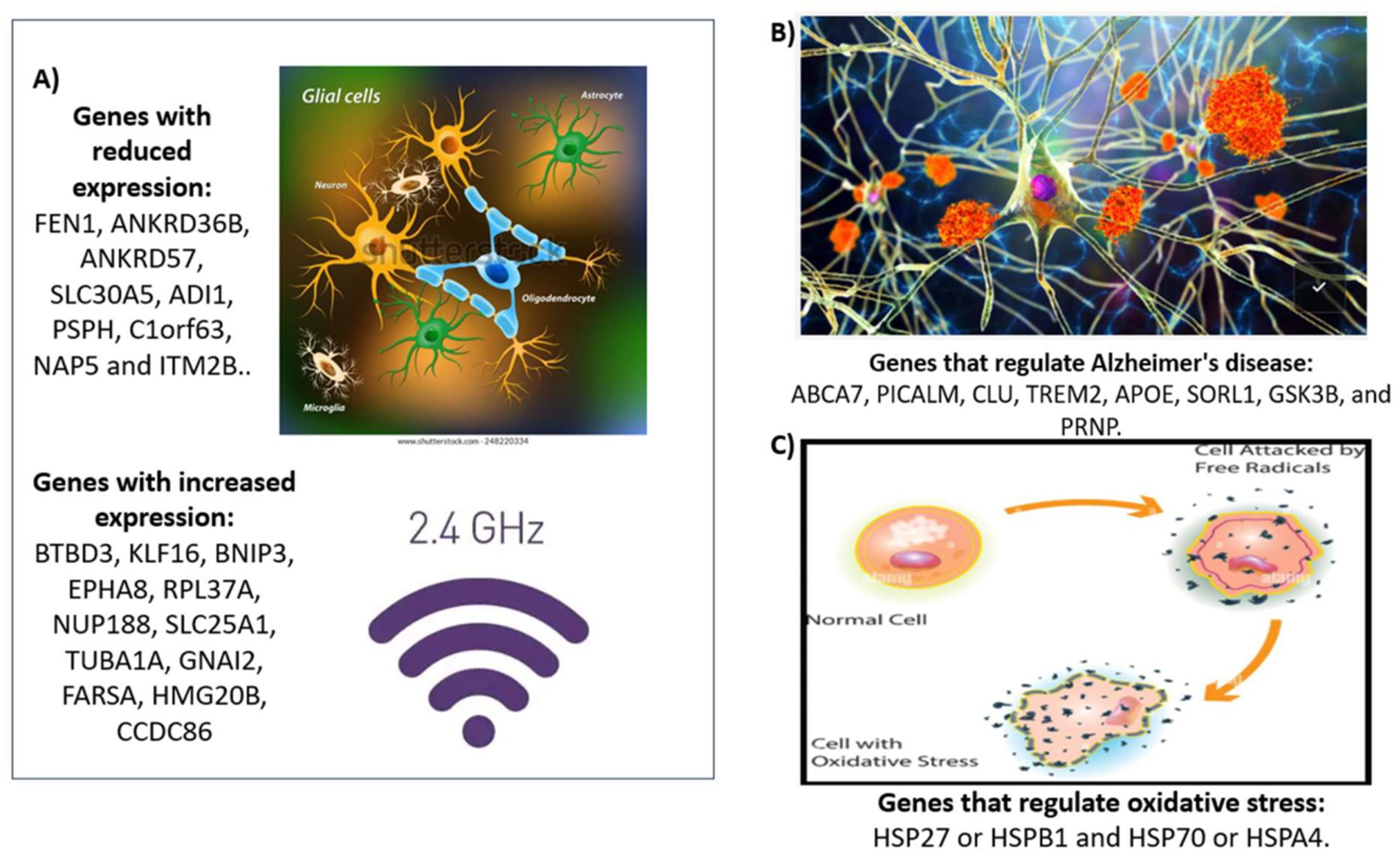 Currently, a variety of genes have been identified that play a role in regulating Alzheimer’s disease. In this review, we will focus specifically on risk genes associated with Alzheimer’s disease that are not linked to hereditary forms. This study aims to investigate how exposure to 2.4 GHz Wi-Fi radiation might influence genes such as ABCA7, PICALM, CLU, TREM2, APOE, SORL1, GSK3B and PRNP, which are considered risk factors for the disease. To address this question, we will explore the STRING database to determine possible relationships between these genes and heat shock proteinsHSP27 or HSPB1 and HSP70 or HSPA4. Additionally, we will examine whether there is any association between the mentioned genes and other genes with differential expressions such as FEN1, ANKRD36B, ANKRD57, SLC30A5, ADI1, PSPH, C1orf63, NAP5, ITM2B, BTBD3, KLF16, BNIP3, EPHA8, RPL37A, NUP188, SLC25A1, TUBA1A, GNAI2, FARSA, HMG20B and CCDC86.