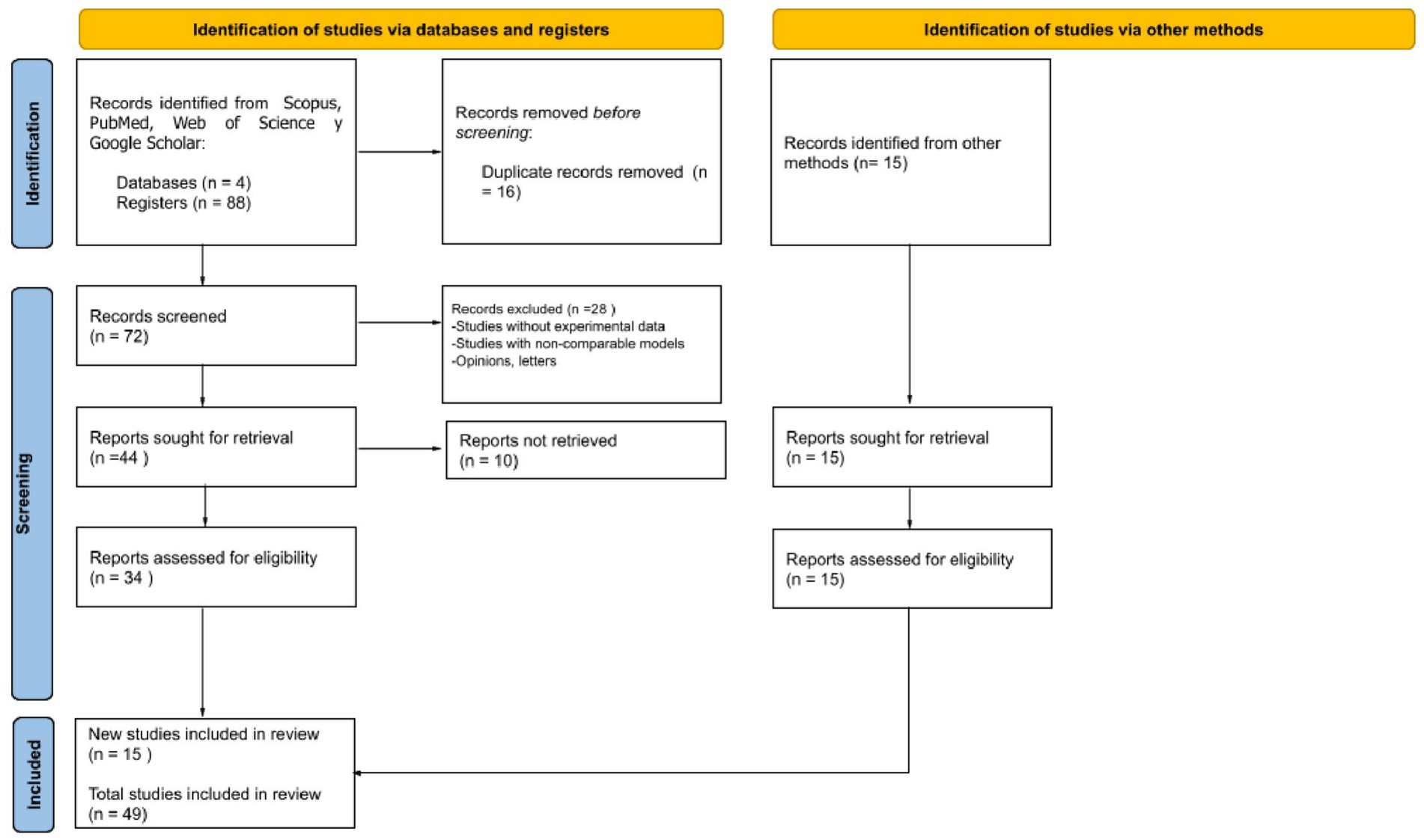A total of 103 records were initially identified through database searching and other sources. After removing 16 duplicates, 72 records remained and were screened based on title and abstract. Following this screening process, 28 records were excluded for not meeting the inclusion criteria. The full text of the remaining 34 articles was assessed for eligibility. However, 10 full-text articles could not be retrieved, despite attempts to access them. No studies were excluded after full-text review. Ultimately, 15 new studies meeting the eligibility criteria were included in the review. Additionally, 34 studies from previous selections were retained. Therefore, a total of 49 studies were included in the final synthesis (see Figure 2) (see Supplementary Table 4).
