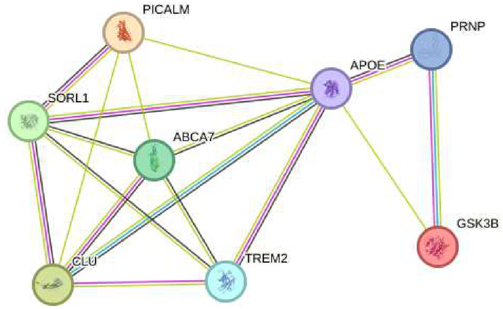 The first gene discussed is ABCA7, which encodes a lipid transporter crucial for regulating lipid metabolism and clearing beta-amyloid protein. Variants in ABCA7 have been associated with an increased risk of beta-amyloid accumulation, a primary neuropathological hallmark of AD (33). In contrast, PICALM plays a role in vesicle formation and trafficking at neuronal synapses, essential processes for maintaining neuronal homeostasis. Variants in PICALM disrupt protein recycling at the synapse, worsening synaptic dysfunction observed in AD (34). Similarly, the CLU (Clusterin) gene contributes to beta-amyloid clearance through its function as an extracellular apolipoprotein. Variants in CLU reduce amyloid clearance capacity, thereby promoting its accumulation in the brain (35). Likewise, TREM2 encodes a receptor expressed in microglial cells that is essential for the brain’s inflammatory response. Mutations in TREM2 impair microglial ability to clear beta-amyloid and control inflammation, exacerbating neuronal damage (36). The APOE gene is the most well-known genetic risk factor for late-onset AD, particularly its ε4 allele. APOE participates in lipid transport and neuronal repair, and the ε4 variant is associated with increased beta-amyloid accumulation (37). Additionally, SORL1, which regulates intracellular trafficking of the amyloid precursor protein (APP), has variants that alter APP processing pathways, promoting beta-amyloid production and increasing the pathological burden (38). Furthermore, GSK3B (glycogen synthase kinase 3 beta) is involved in tau protein hyperphosphorylation, an event that leads to the formation of neurofibrillary tangles. Dysfunctional GSK3B activity is linked to accelerated neurodegeneration in AD (39). Lastly, although the PRNP gene is primarily associated with prion diseases, it has been suggested to interact with beta-amyloid, modulating its toxicity and indirectly contributing to AD pathogenesis (40) (see Figure 3).