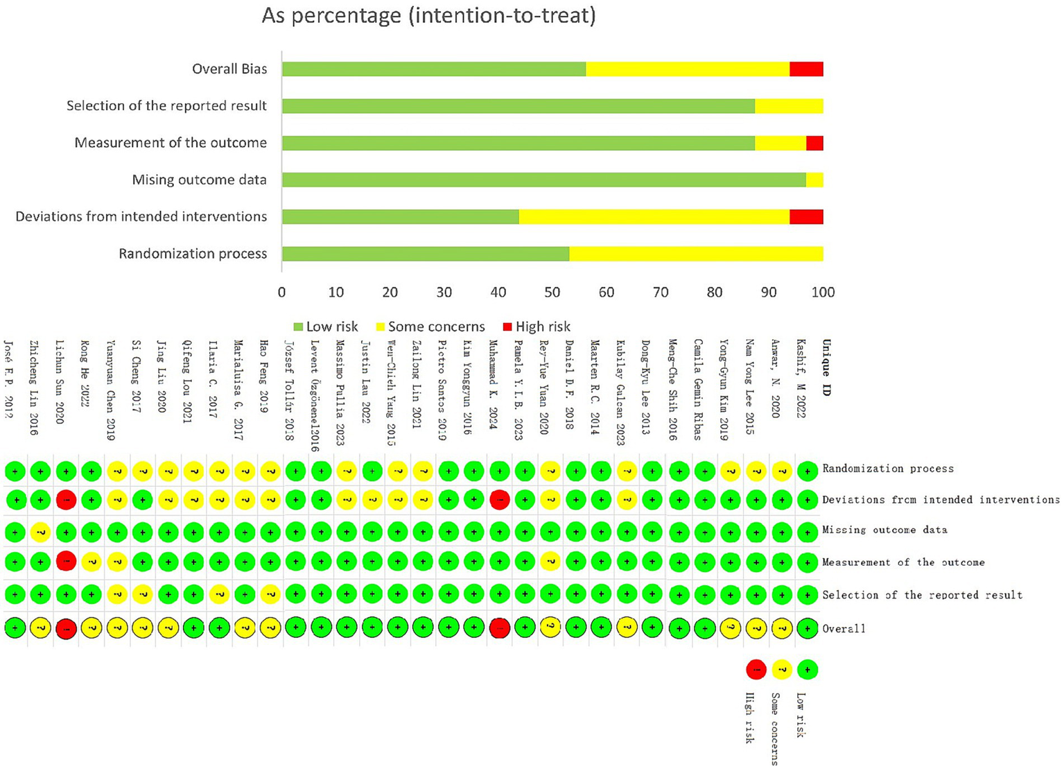The Cochrane Risk - of - Bias Tool (version 2.0) was used to assess bias risk, covering random sequence generation, allocation concealment, blinding, missing outcome data, and selective reporting (27). Overall bias risk was categorized as follows: