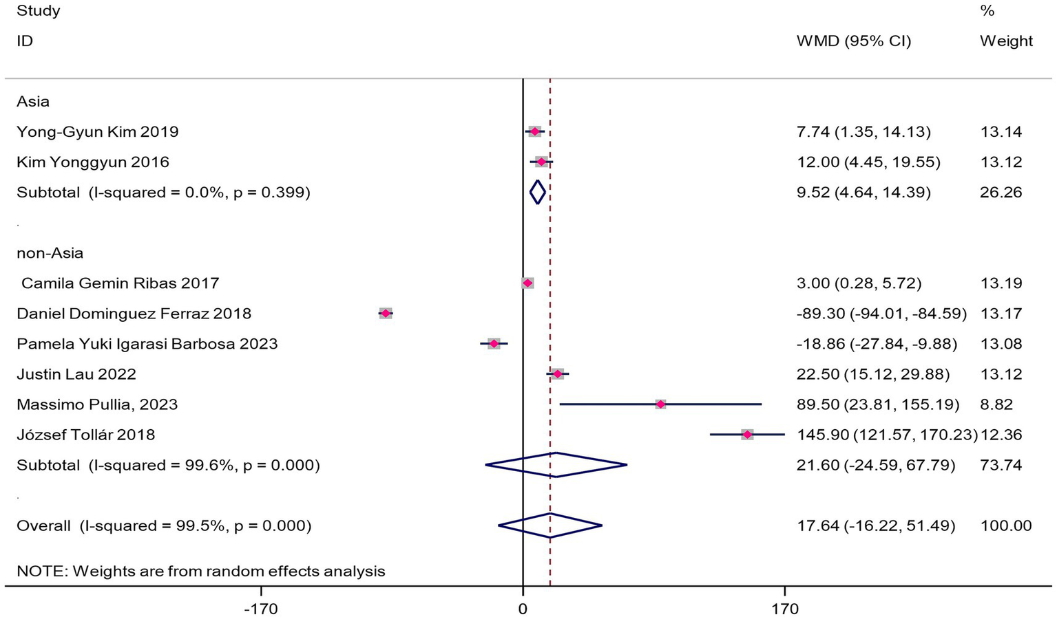 The non-Asian subgroup did not reach statistical significance (WMD = 21.60 m, 95%CI -24.59-67.79, p = 0.36), but the effect size reached MCID (WMD = 21.6 m > 14 m).