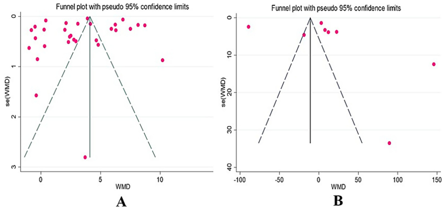 Funnel plots were first used to visually assess publication bias in the included studies. The BBS funnel plot (Figure 5A) showed a relatively symmetrical distribution, while the 6MWT funnel plot (Figure 5B) exhibited some asymmetry, making it difficult to accurately judge the presence of publication bias based solely on funnel plots. Therefore, Egger’s test was further used for quantitative analysis. The results showed no significant publication bias for both BBS (p = 0.62 > 0.05) and 6MWT (p = 0.66 > 0.05), indicating a low risk of publication bias in the included studies.