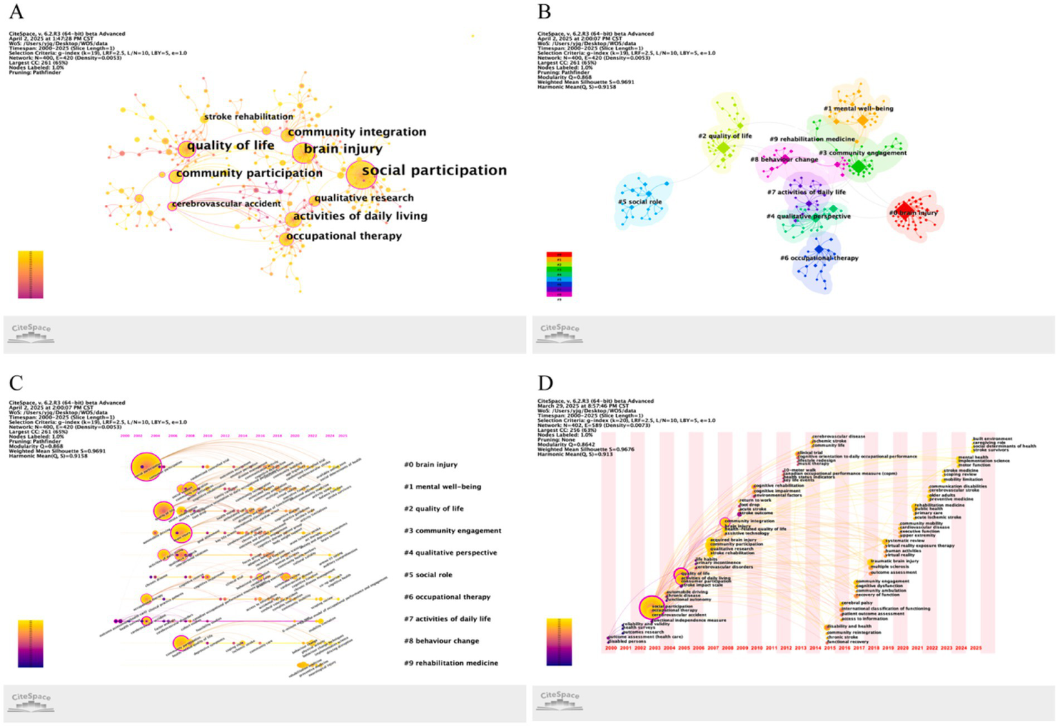 Bibliometric landscape of stroke social participation research on co-citation networks and temporal evolution. (A) Journal co-citation network. (B) Reference co-citation network. (C) Thematic cluster mapping of co-cited reference. (D) Timeline analysis of co-cited reference.