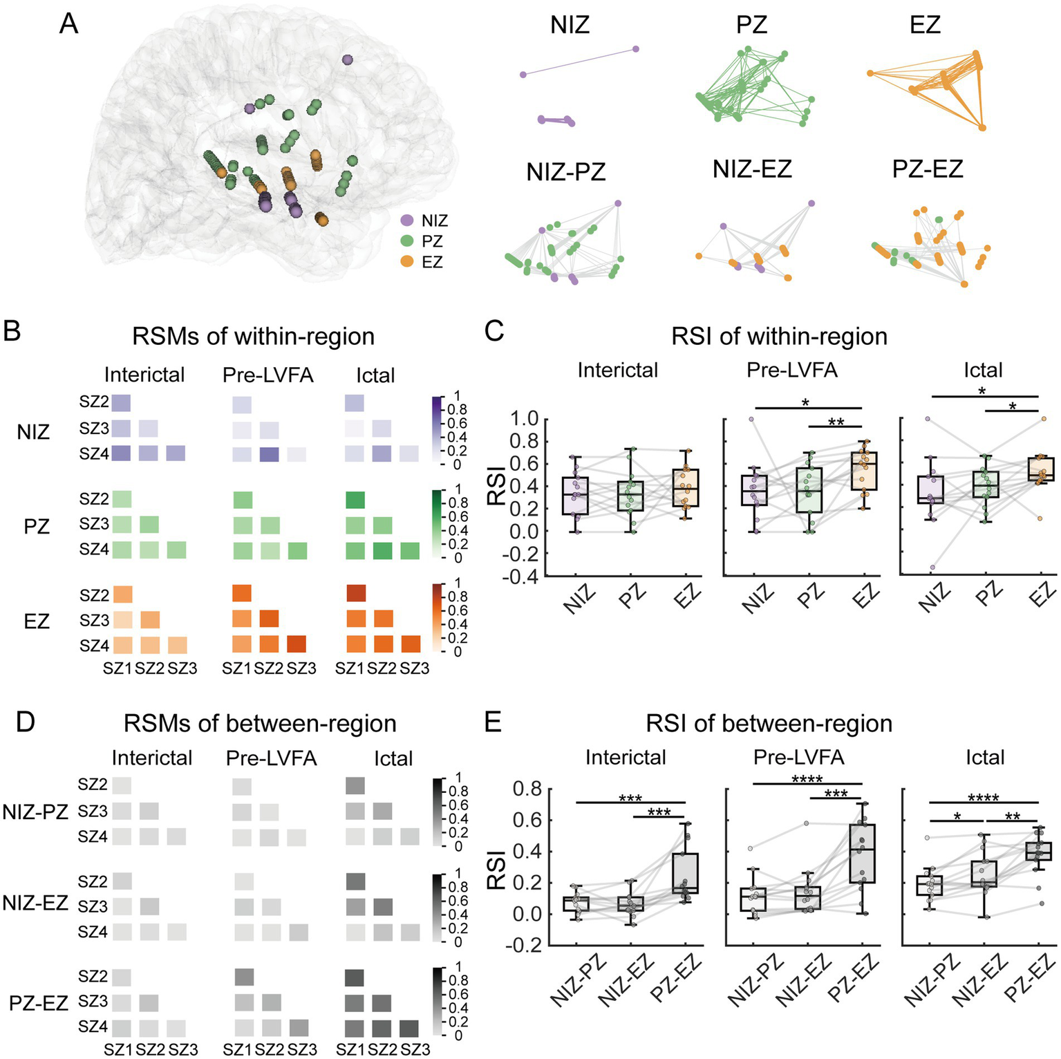Between-seizure reproducibility of connectivity patterns within- and between-region during interictal, pre-LVFA, and ictal periods. (A) Electrode distribution across zones in patient 10, with within- and between-region connections are illustrated. The lines represent the connection relationships. (B) RSMs for within-region connectivity during the interictal, pre-LVFA, and ictal periods. Each matrix represents six seizure pairs from four seizures, with color depth indicating reproducibility (darker colors = higher similarity). (C) RSI for within-region connectivity, averaged across RSMs, during interictal, pre-LVFA, and ictal periods. (D) RSMs for between-region connectivity during the same periods. (E) RSI for between-region connectivity during the same periods. (****p < 0.0001, ***p < 0.001, **p < 0.01, *p < 0.05).