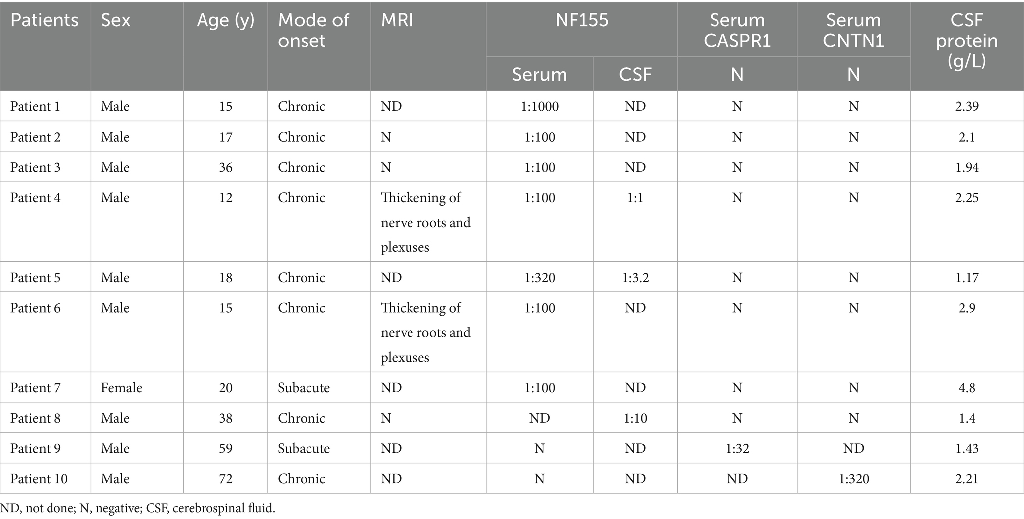 Out of 29 CIDP patients, 10 tested positive for autoantibodies. The clinical data for these patients are summarized in Table 1. Among these, 8 patients were positive for NF155, 1 for CNTN1, and 1 for CASPR1. No patients were found to be positive for NF186.
