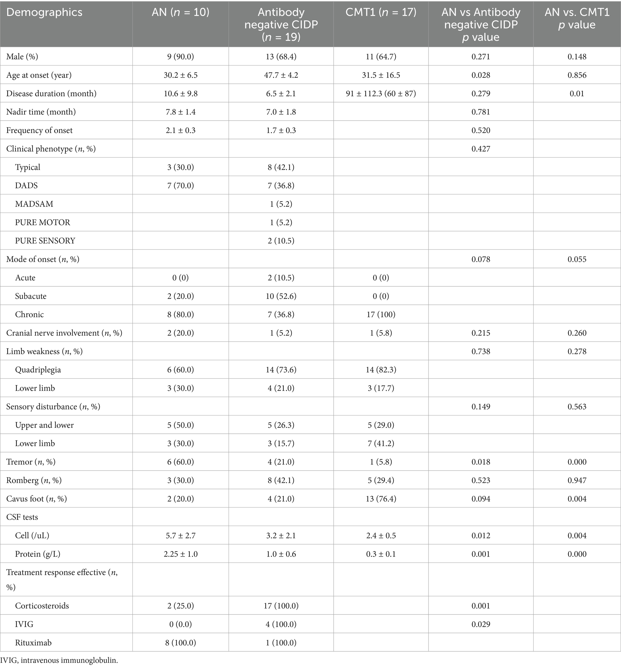 Methods: We collected clinical data from 29 patients who met the European Federation of Neurological Societies/Peripheral Nerve Society (EFNS/PNS) electrophysiological diagnostic criteria for definite CIDP. Autoimmune antibodies (anti-NF155, NF186, CNTN1, and CASPR1) were tested using cell-based assays. Additionally, 17 CMT1 patients, diagnosed with hereditary motor sensory neuropathy type 1, were included. We compared the clinical and electrophysiological characteristics of AN, antibody-negative CIDP, and CMT1 patients.