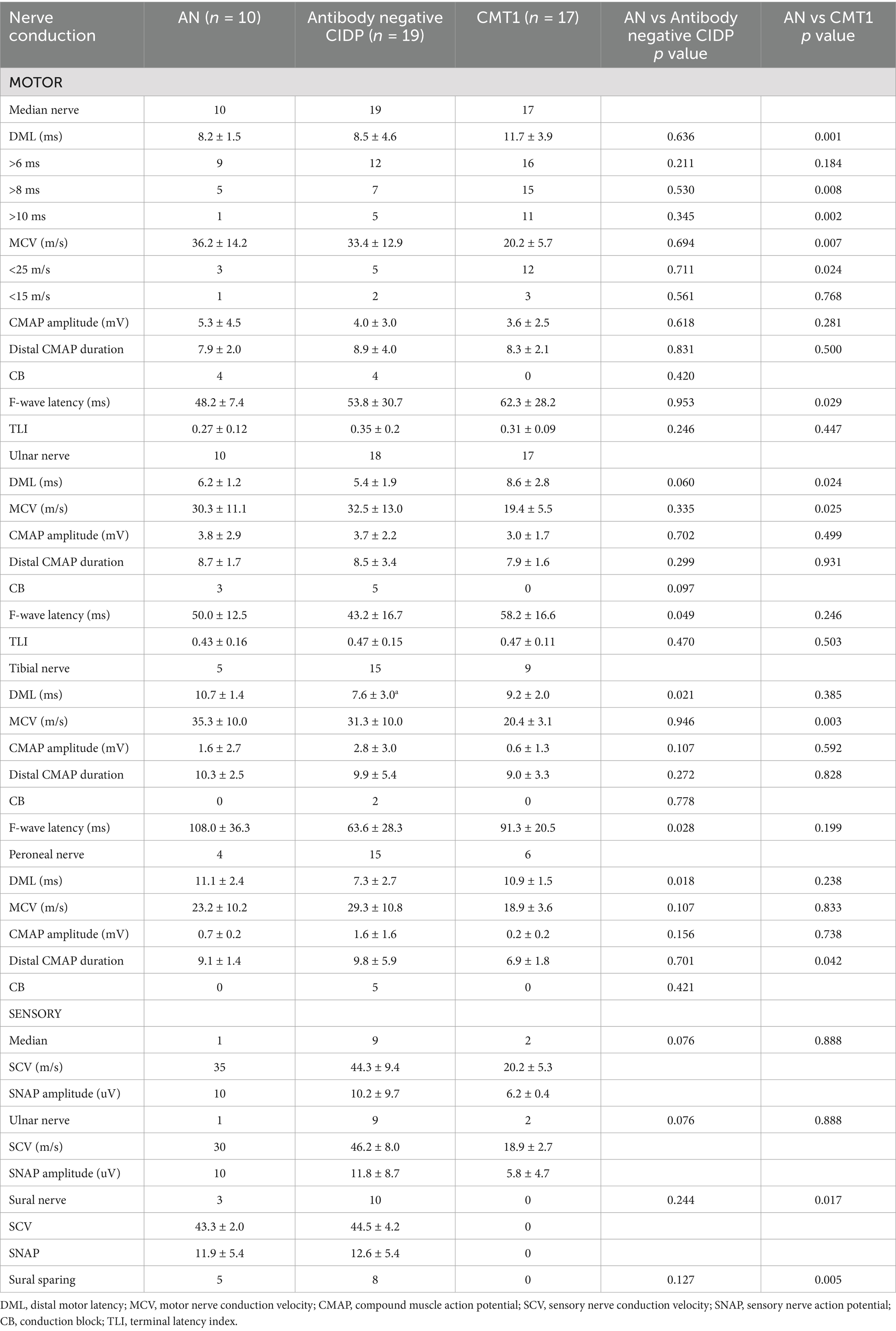 Among the eight NF155 antibody-positive patients, six had an onset age under 20 years. Two patients exhibited demyelination without CB resembling CMT1 disease. Our study revealed that CMT1 patients had more pronounced DML prolongation and MCV reduction in the median and ulnar nerves compared to AN patients. Among patients with DML > 8 ms and MCV < 25 m/s in median nerve conduction, AN accounted for 3 cases, CIDP 3 cases and CMT1 15 cases, of which 1, 2 cases and 0 case were accompanied by CB. Only 1 patient with DML > 10 ms and MCV < 25 m/s in median nerve. Unlike the conclusions of Ogata (25), they believed that MCV on median nerve <24 m/s or on ulnar nerve <26 m/s were predictive of positive antibody CIDP, while the slowest MCV not average value was selected to analysis and it had low sensitivity. We concerned that DML greater than 8 ms and MCV less than 25 m/s in the median nerve is more supportive of a diagnosis of CMT1 not AN patients. Our study suggested that most AN patients had severe demyelination than CIDP, but were less severe than CMT1, which may be related to the quick treatment, and none of the patients had a family history, and some patients had negative genetic test. For a small number of patients with AN who had severe demyelination without conduction block, further identification should be combined with lumbar puncture and family history.