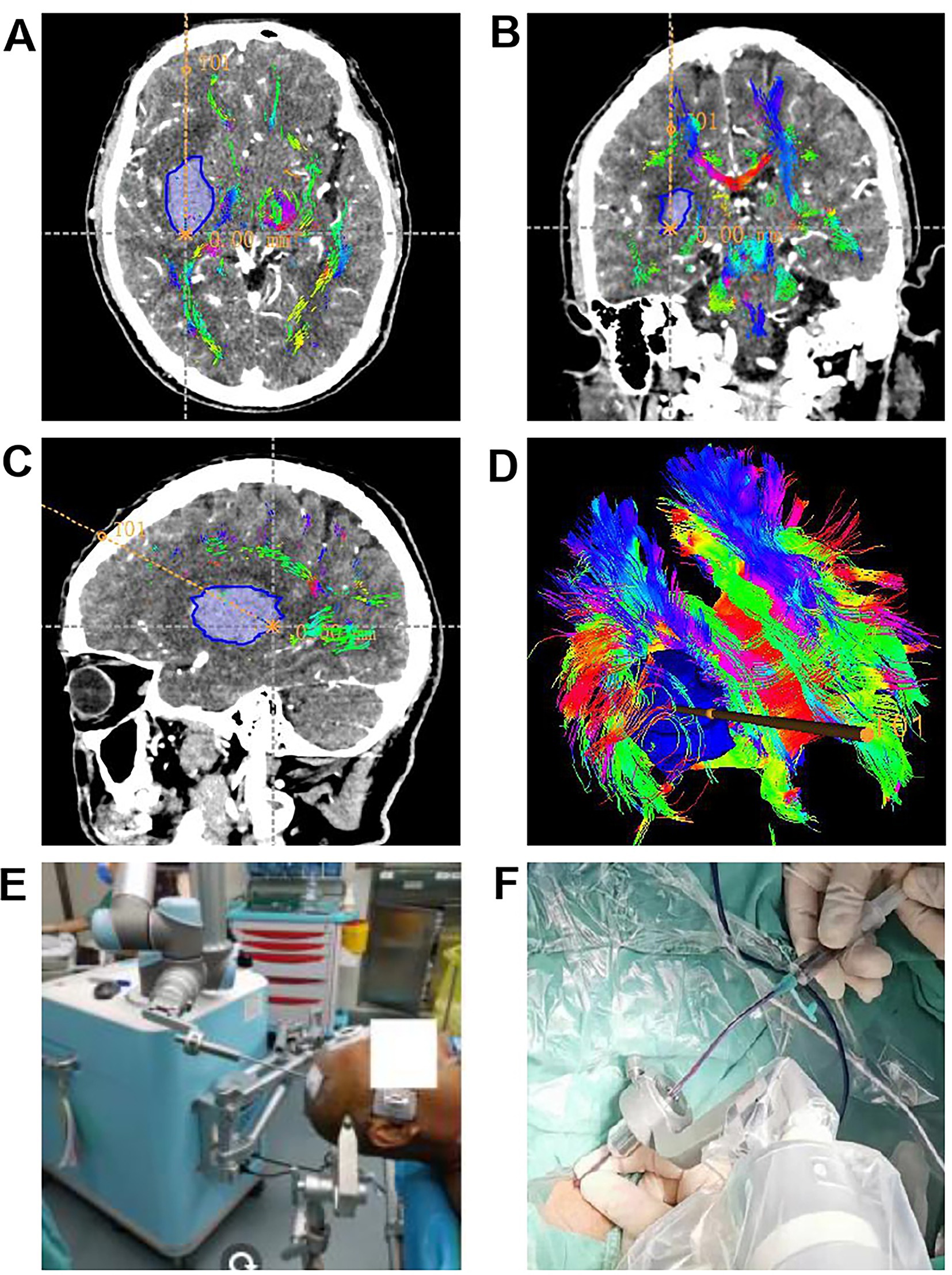 Figure 2. Surgical planning pathway and surgical procedure diagram. (A–D) The Remebot surgical robot designs a predefined surgical trajectory based on CTA and DTI data, ensuring avoidance of blood vessels while navigating through DTI-identified gaps to reach the target site. Images are presented in axial (A), coronal (B), sagittal (C) views, along with a three-dimensional reconstruction (D). (E,F) Surgical intervention treatment procedure.