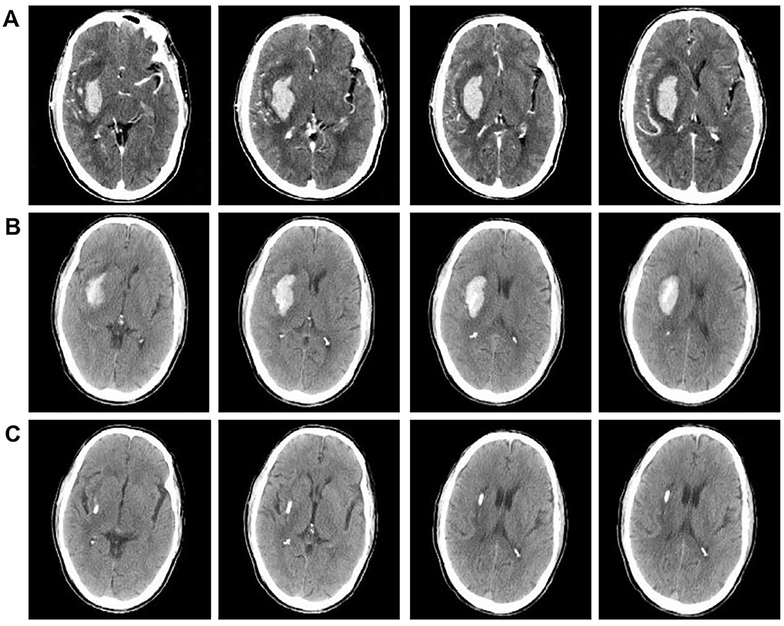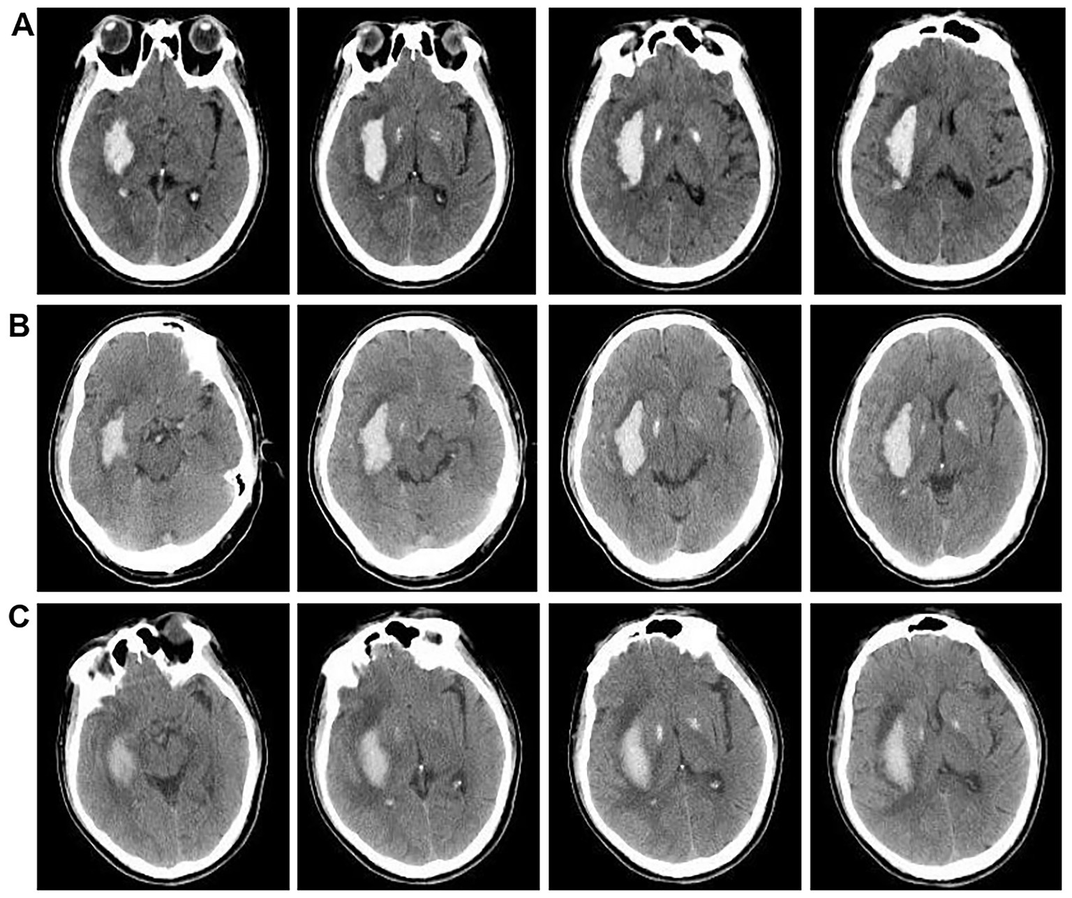 Figure 3. CT comparison images before and after surgical intervention. (A) Brain CTA scan images of patients upon admission. (B) Brain CT scans of patients 24 h post-surgery. (C) Brain CT scans of patients 3 days post-surgery.
