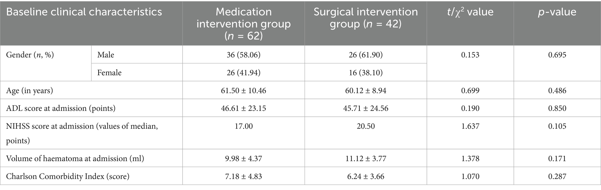 Determination of sample size for two-sample means, employing a two-sided test with α = 0.05 and β = 0.2, utilizing a 1:1 sample ratio. Preliminary investigations indicated that the ADL scores were μ1 = 46.25 ± 22.59 and μ2 = 63.75 ± 21.21, with σ = 9.0. The PASS15.0 software determines that each group required a minimum of 21 participants. All statistical data analyses were conducted using SPSS software (version 20.0). All data underwent normality and homogeneity of variance tests. For normally distributed data, means and standard deviations (𝑥̄ ± S) were reported, and independent samples t-tests were used to assess differences in group means. For count data, chi-square tests were employed to compare proportions across categories. Univariate analysis of variance was employed to adjust for potential confounding factors such as age, gender, and the Charlson Comorbidity Index. Statistical significance was set at p < 0.05, with p < 0.01 indicating highly significant differences. We emphasize that while statistical significance is a crucial indicator for evaluating results, clinical relevance is equally important. Beyond p-values, we also calculated effect sizes for ADL scores, NIHSS scores, and MRS scores to quantify the magnitude of intergroup differences.