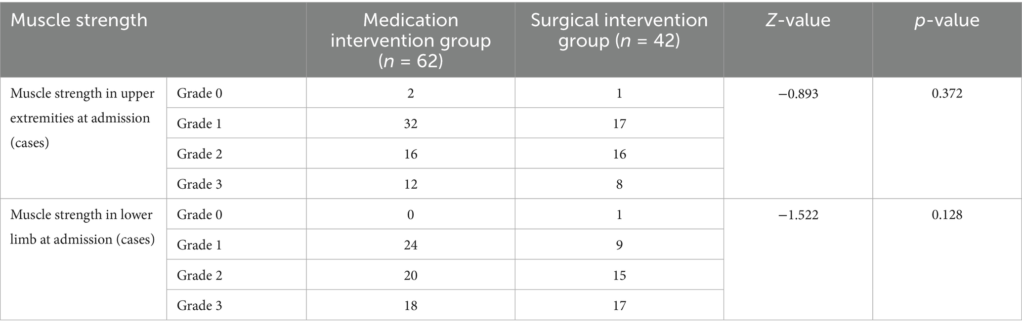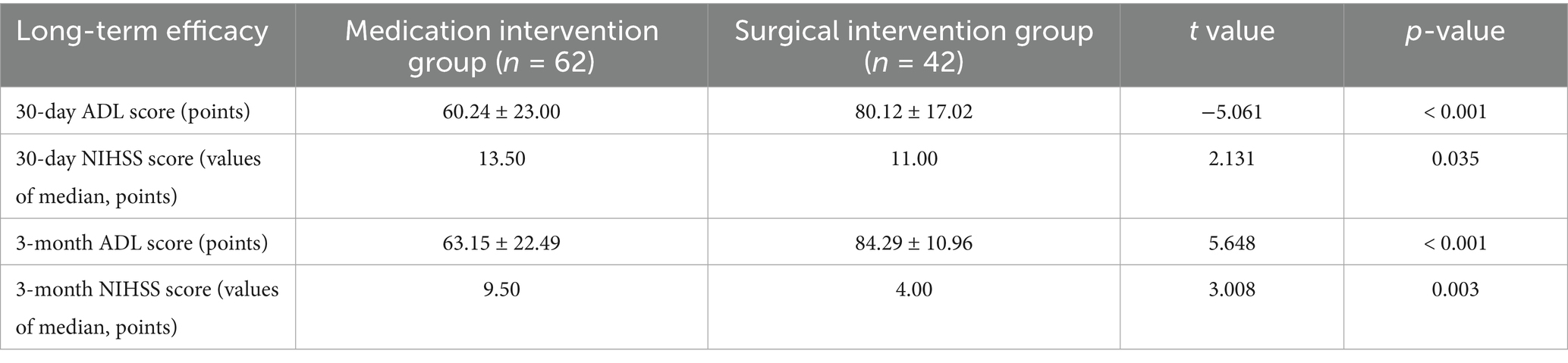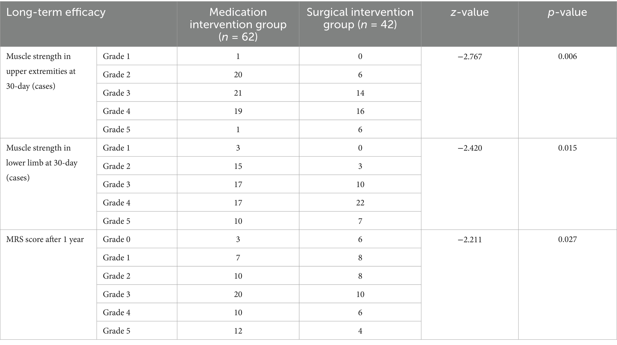 5. The 30-day muscle strength in both the upper and lower extremities, as well as the MRS score after 1 year, showed significant differences between the two groups (p < 0.05), with the surgical intervention group exhibiting superior efficacy compared with the medication intervention group (Table 5).