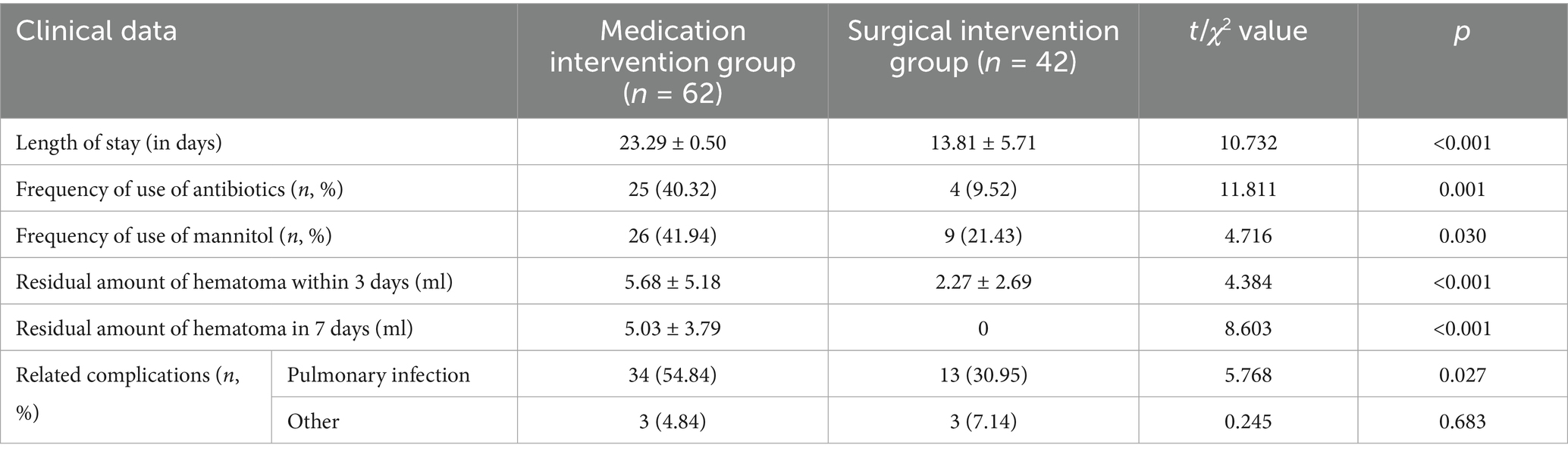 3. Patients in the surgical intervention group experienced markedly reduced hospital stays, lower incidence of lung infections, and decreased utilization of antibiotics and mannitol compared with the medication intervention group. Three days post-surgery, the residual hematoma volume was markedly reduced in the surgical intervention group compared to that in the medication intervention group. in patients treated with surgical intervention, the drainage tube was retained for 3–5 days, and the hematoma was entirely resolved by 7 days, which was markedly shorter than the average of 21 days for those treated with medication intervention. The two groups exhibited no significant differences in the other problems (p > 0.05), as shown in Table 3.