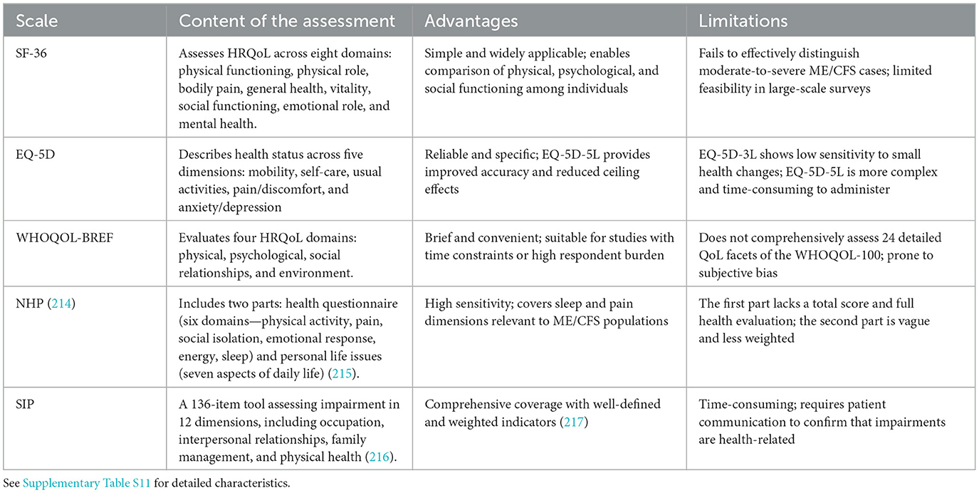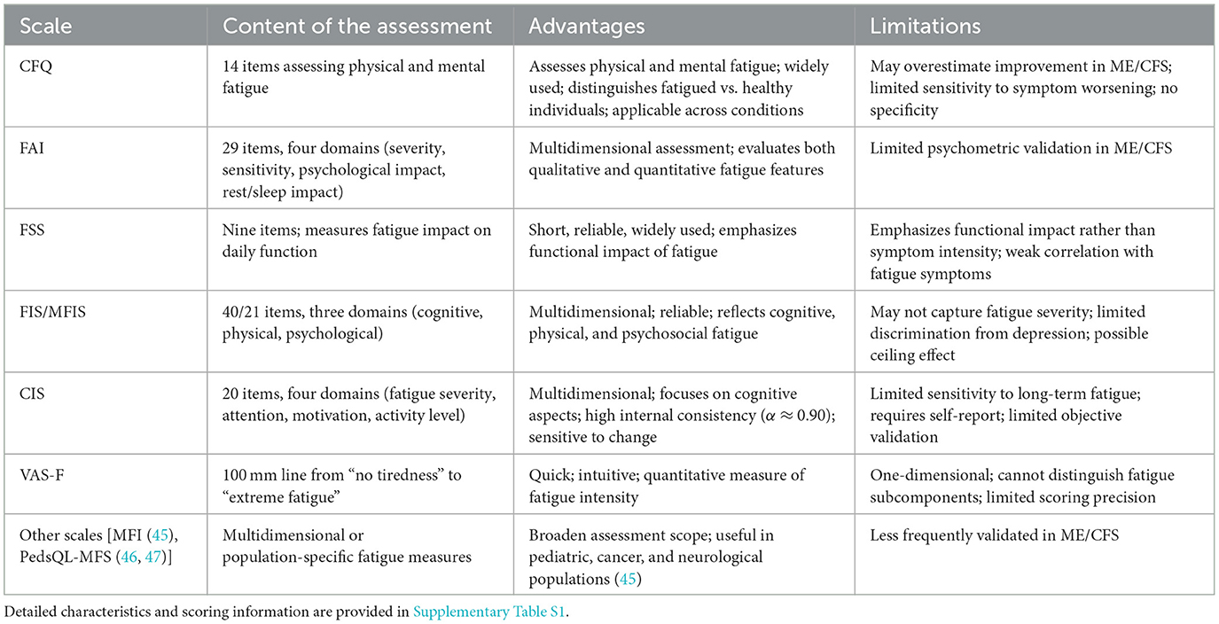 Additional instruments applied in ME/CFS research include the multidimensional fatigue inventory (MFI) (41), the PedsQL multidimensional fatigue scale (PedsQL-MFS) (42), the functional assessment of chronic illness therapy-fatigue scale (FACIT-F) (43), and the fatigue scale for motor and cognitive functioning (FSMC) (44). Each has distinct structural or dimensional characteristics but is used relatively infrequently, as their target populations or original design contexts differ from those of ME/CFS. The psychometric validity and reliability of these instruments in ME/CFS populations remain to be further established.