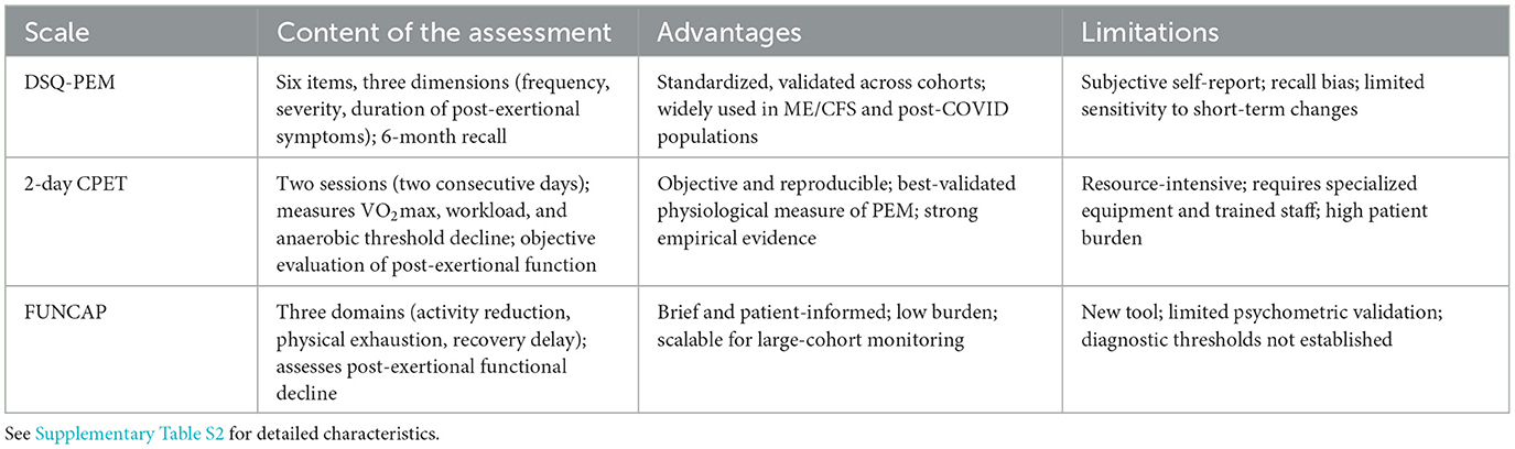 Table 2 summarizes the key assessment tools for PEM in ME/CFS, while detailed methodological and psychometric information is provided in Supplementary Table S2.