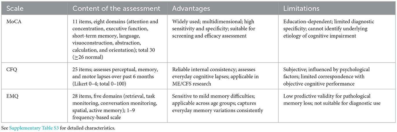 The EMQ, developed by Sunderland et al. (75), is a 28-item self-report tool designed to assess everyday memory difficulties across five domains: retrieval, task monitoring, conversation monitoring, spatial memory, and active memory (76). Each item is rated on a nine-point scale from 1 (not at all in the past 6 months) to 9 (more than once a day), with higher scores indicating greater cognitive impairment. The EMQ has been used to evaluate cognitive dysfunction in ME/CFS when examining the relationship between subjective complaints and objective neuropsychological performance (77). It demonstrates good sensitivity for detecting mild memory problems in healthy populations and can be applied in both children and adults (78). However, its positive predictive value for identifying pathological memory disorders is limited, and it should not be used as a diagnostic tool (79).