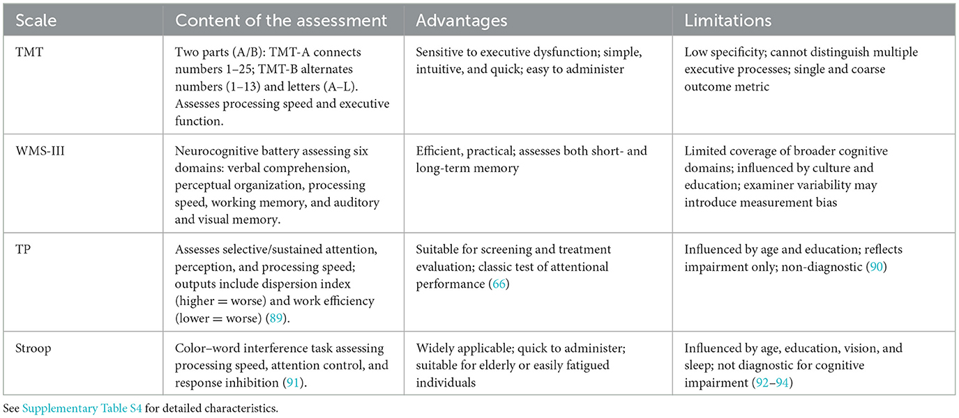 Table 4 summarizes the principal objective cognitive assessment tools, while Supplementary Table S4 provides detailed information on their psychometric properties, validation evidence, and clinical applicability.