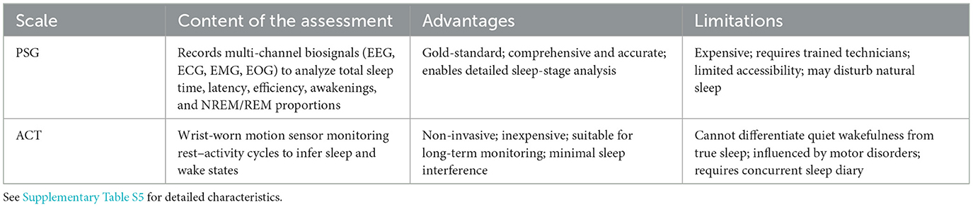 Table 5 summarizes the objective sleep assessment tools, while Supplementary Table S5 details their psychometric properties, validation evidence, and clinical applicability.