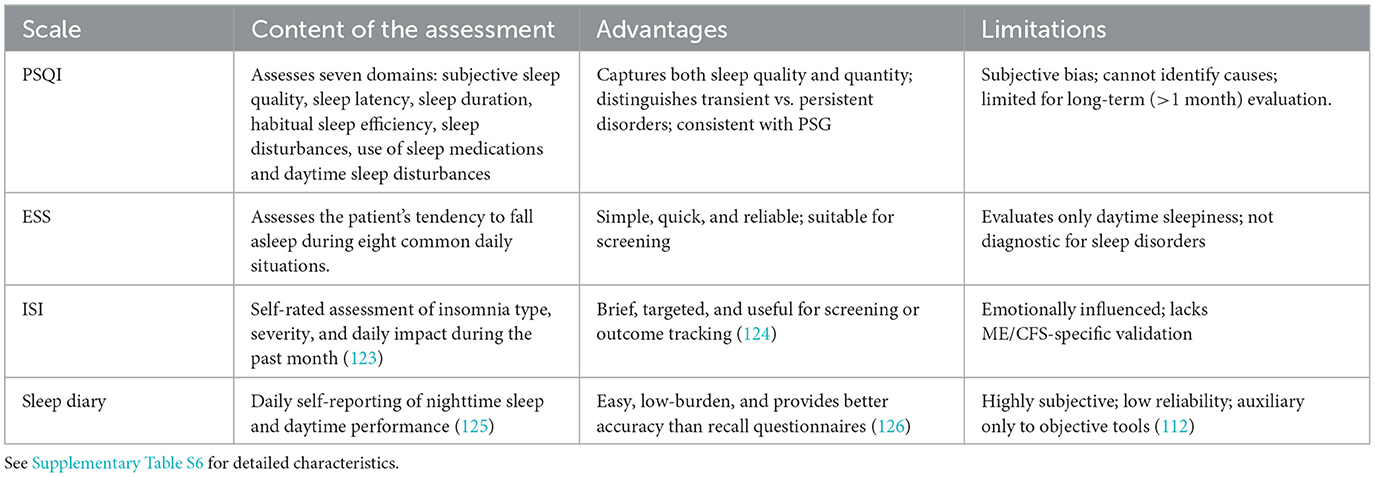 Castro-Marrero et al. (114) used the PSQI to assess sleep quality and its impact on quality of life in Spanish ME/CFS patients, while Wei et al. (115) applied it to examine insomnia severity and circadian rhythm alterations associated with serum factors in ME/CFS. Although the PSQI reflects subjective sleep perception and cannot determine the specific etiology of sleep disturbance (116), it assesses both qualitative and quantitative aspects of sleep, differentiates transient from persistent insomnia, and demonstrates strong concordance with PSG findings (117). Owing to its practicality, psychometric validity, and broad applicability, the PSQI remains a reliable and versatile instrument for clinical and research evaluation of sleep in ME/CFS.