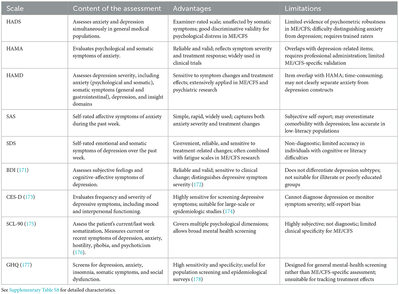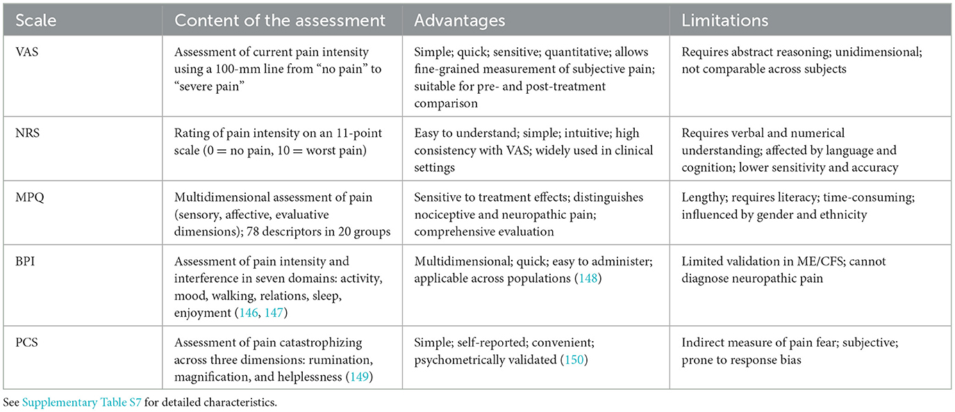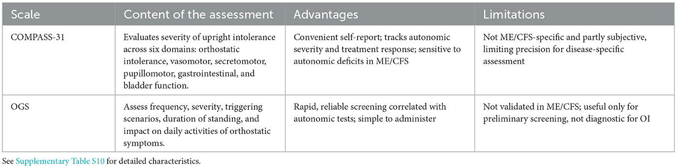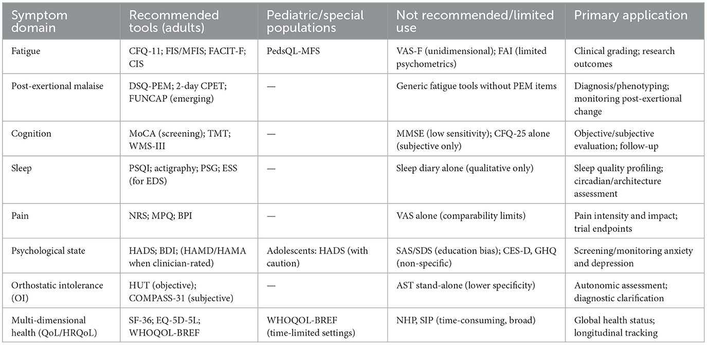In the absence of objective biomarkers, validated symptom assessment scales remain essential for clinical evaluation, disease monitoring, and research comparability (7). This review synthesizes established and emerging instruments across key symptom domains, critically appraises their validity and applicability, and provides comparative tables and practical recommendations to identify suitable tools, highlight limitations, and outline priorities for future research in ME/CFS.