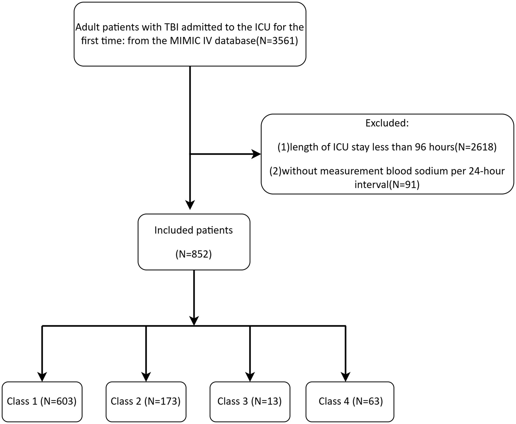 Flowchart describing patient selection from the MIMIC IV database. Out of 3,561 adult TBI patients admitted to the ICU, 2,618 were excluded due to stays less than 96 hours, and 91 due to missing blood sodium measurements. This results in 852 included patients, further divided into Class 1 with 603 patients, Class 2 with 173 patients, Class 3 with 13 patients, and Class 4 with 63 patients.