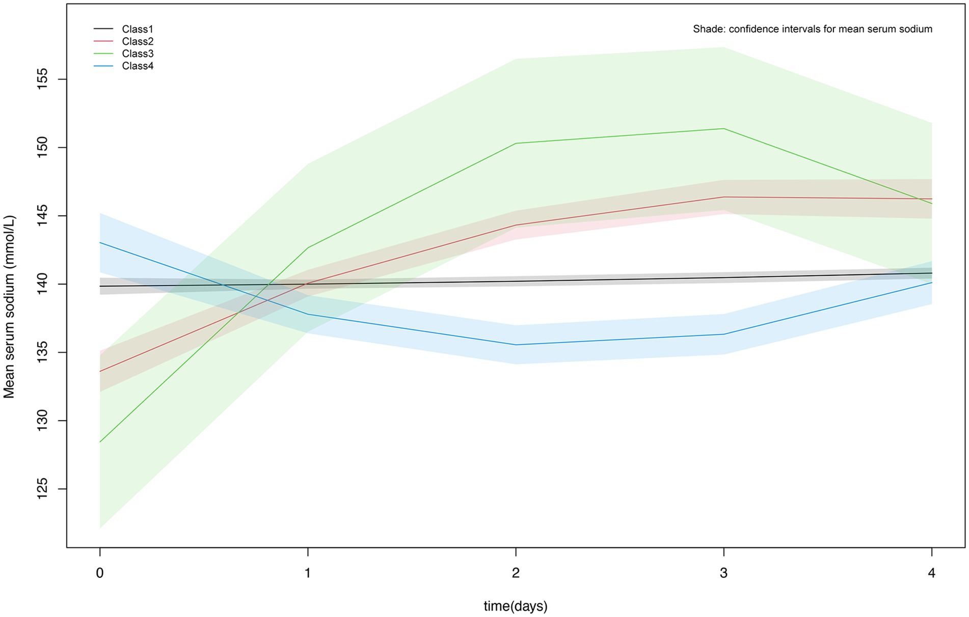 Line graph showing mean serum sodium levels over time in days for four classes. Class 1 declines slightly, while Classes 2 and 3 rise. Class 4 peaks and then drops. Shaded areas represent confidence intervals.