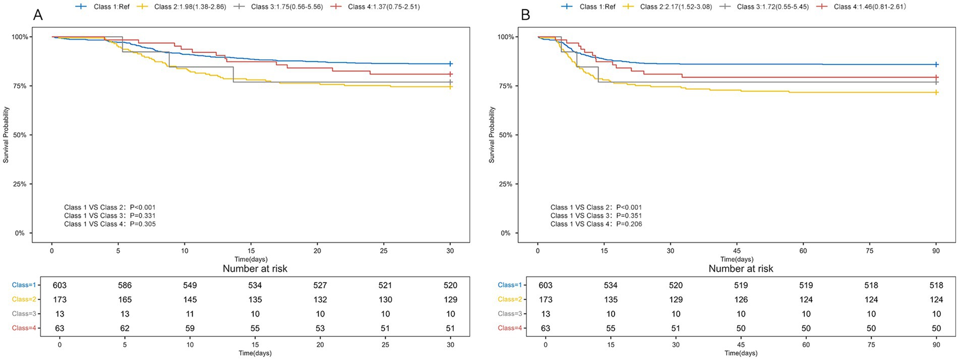Two Kaplan-Meier survival plots, labeled A and B, compare survival probabilities across four classes over time. Class 1 serves as the reference. Plot A covers 30 days, with Class 2 showing a significant difference from Class 1 (p<0.001). Plot B extends to 90 days, also showing significant differences between Class 1 and Class 2 (p<0.001). Numbers at risk are provided below each plot for precise time points.