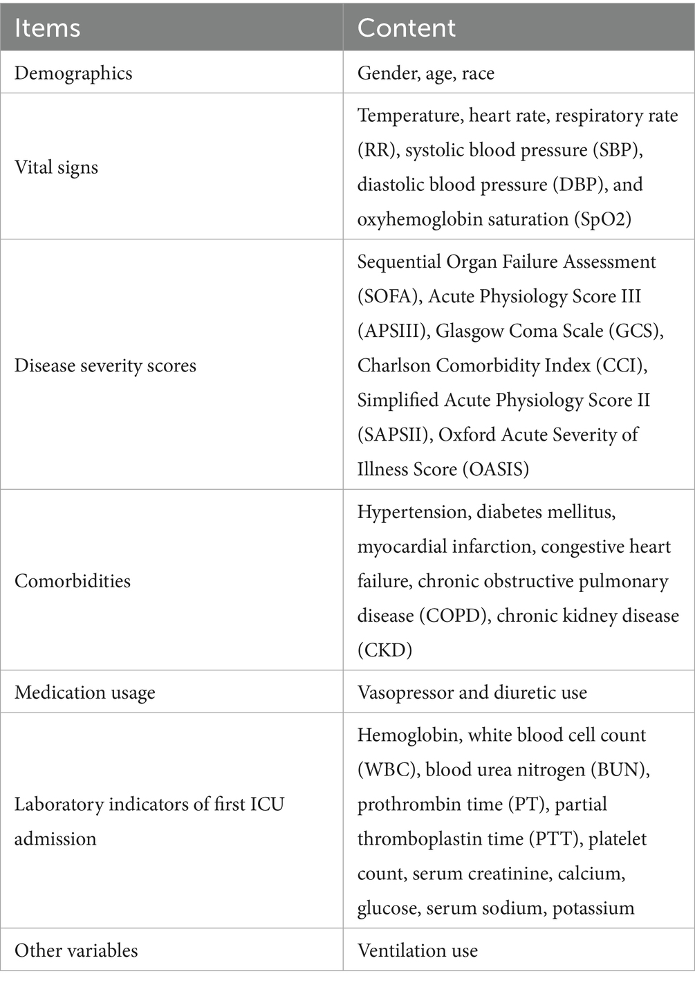 The data collected in this study consisted of seven categories, specifically demographics, vital signs, disease severity scores, comorbidities, medication usage, laboratory indicators of first ICU admission, and other variables. The specifics of each category are presented in Table 1.