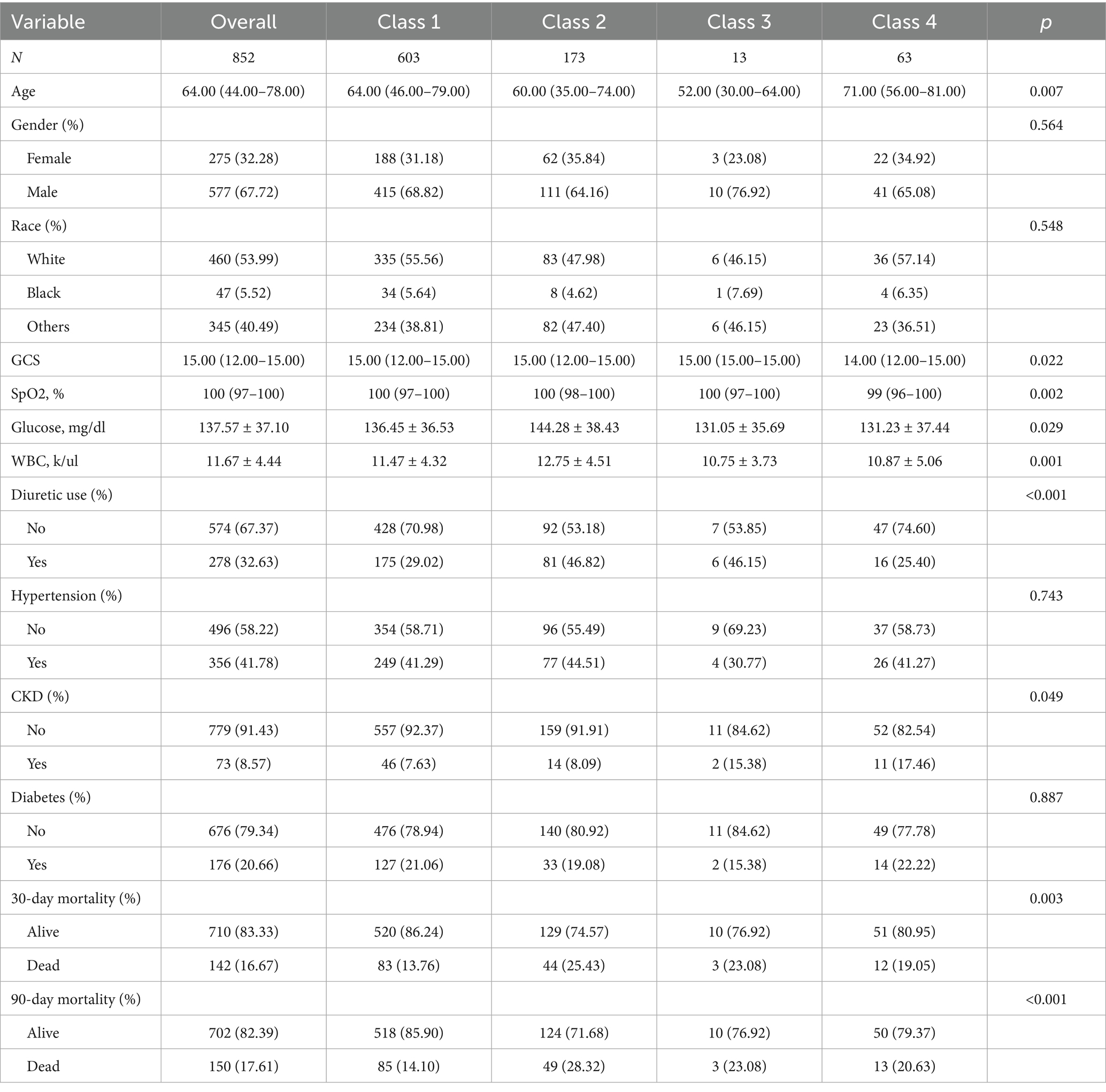 The MIMIC-IV database provided data on 852 TBI patients, with the detailed screening process shown in Figure 1. Table 2 showed the baseline characteristics of patients with TBI (including only clinically or statistically significant variables) divided on the basis of 4 categories of serum sodium level classes. Complete baseline characteristics data were detailed in Supplementary Table 4. Patients had a median age of 64 years, and most were male, accounting for 67.72%. There were 356 patients with comorbid hypertension (41.78%), 73 patients with CKD (8.57%), and 176 patients with diabetes mellitus (20.66%) with a more balanced distribution of gender and ethnicity in each group.