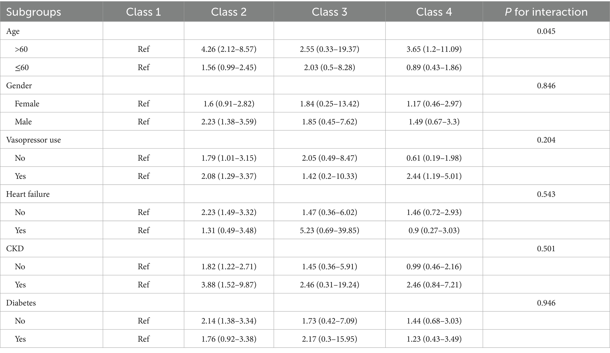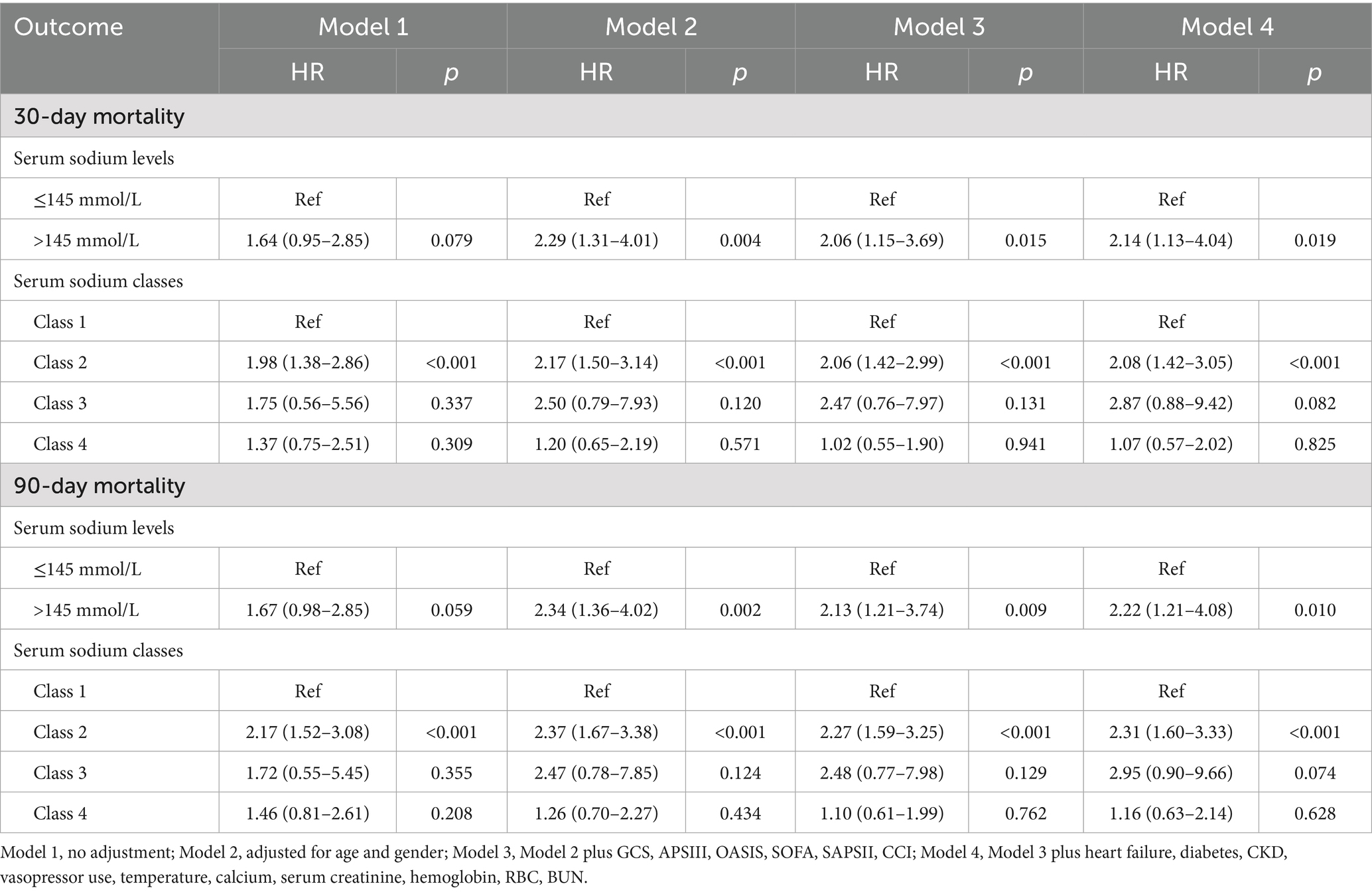 The associations between the initial serum sodium level upon ICU admission (a categorical variable) and the subsequent serum sodium trajectory within the first 96 h of ICU stay, as well as their impact on mortality risks, were investigated in our study. And then, the Hazard ratios (HRs) and 95% confidence intervals (CIs) for 30-day and 90-day mortality were calculated. Additionally, mortality risks across different serum sodium patterns were compared using Kaplan–Meier survival analysis and log-rank tests. Univariate Cox regression (model 1) was used to screen covariates linked to 30-day mortality (Supplementary Table 2), and those with a p-value less than 0.05 were included in further multivariate models for adjustment. In model 2, adjustments were made for age and sex, and model 3 added further adjustments for GCS, APSIII, OASIS, SOFA, SAPSII, CCI, and model 4 additionally included heart failure, diabetes mellitus, CKD, vasopressor use, temperature, calcium, serum creatinine, hemoglobin, RBC, and BUN. In addition, age, sex, CKD, diabetes, heart failure, and vasopressor use were analyzed in subgroups. Additionally, to verify the robustness of the findings, we performed two sensitivity analyses. We first repeated the main analyses after imputing missing values using mean interpolation, given that the proportion of missing data for all covariates was less than 5% (Supplementary Table 3). We then reanalyzed the remaining classes after excluding the Class 3 subgroup, which had a small sample size that may have affected the statistical validity, from the analysis of 30-day and 90-day mortality. Data processing and analysis in this study were performed using DecisionLinnc1.0 software (15) and R (version 4.4.2). The threshold for statistical significance was set at a two-tailed p-value of 0.05.