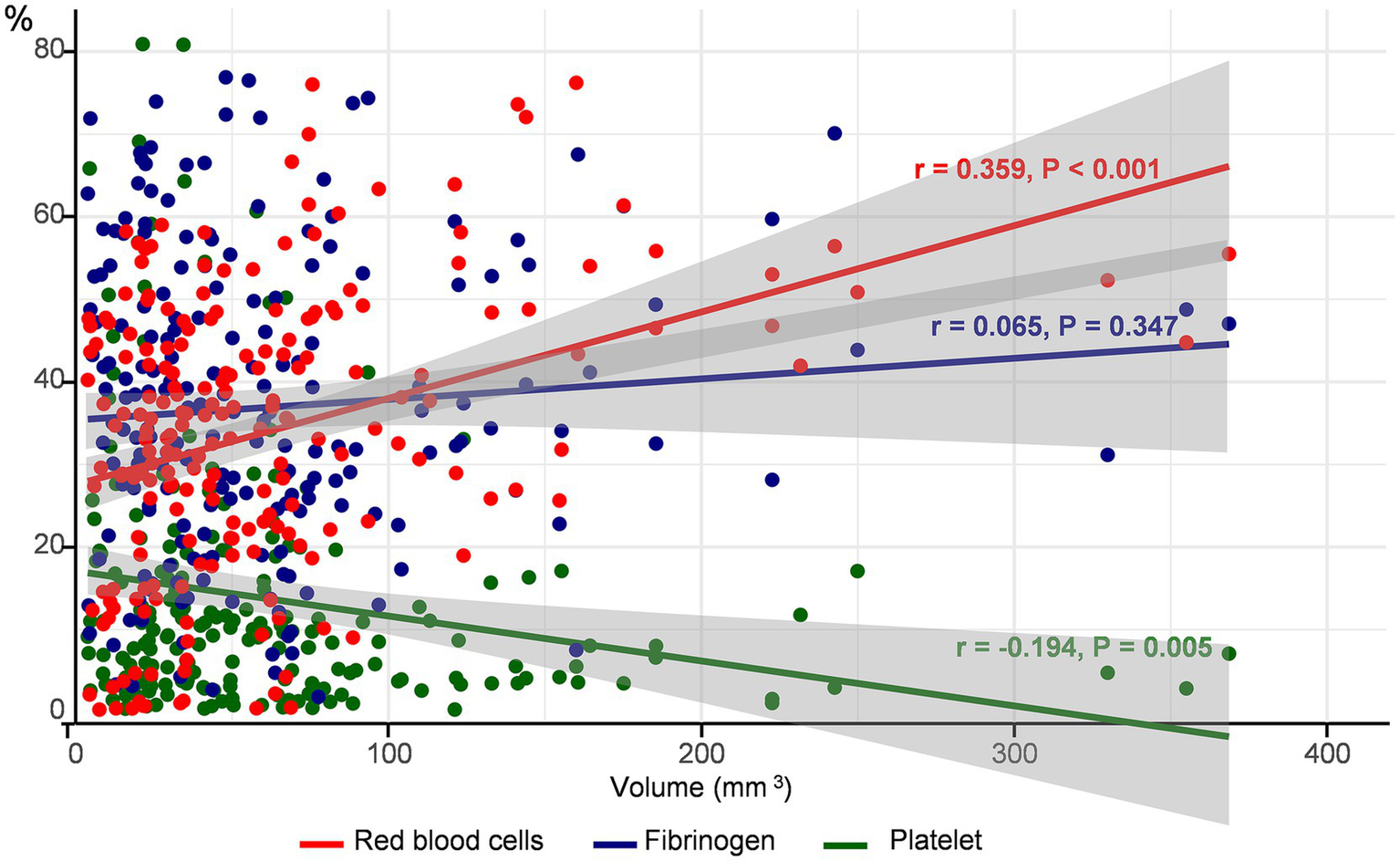 Among 210 patients, the median (interquartile range) thrombus volume was 43.7 (23.5, 74.5) mm3. Increased thrombus volume correlated with high RBC proportion (r = 0.359, p < 0.001) and low platelet proportion (r = −0.194, p = 0.005). Thrombus volume was independently related to the RBC proportion (β 1.00, standard error [SE] 0.27, p < 0.001), mixed (β 21.04, SE 10.10, p = 0.038), and erythrocytic pattern (β − 29.78, SE 11.54, p = 0.011). The number of fragmented thrombi during the procedure was independently related to thrombus volume (β 0.006, SE 0.002, p = 0.006) and RBC proportions (β 0.18, SE 0.009, p = 0.049).